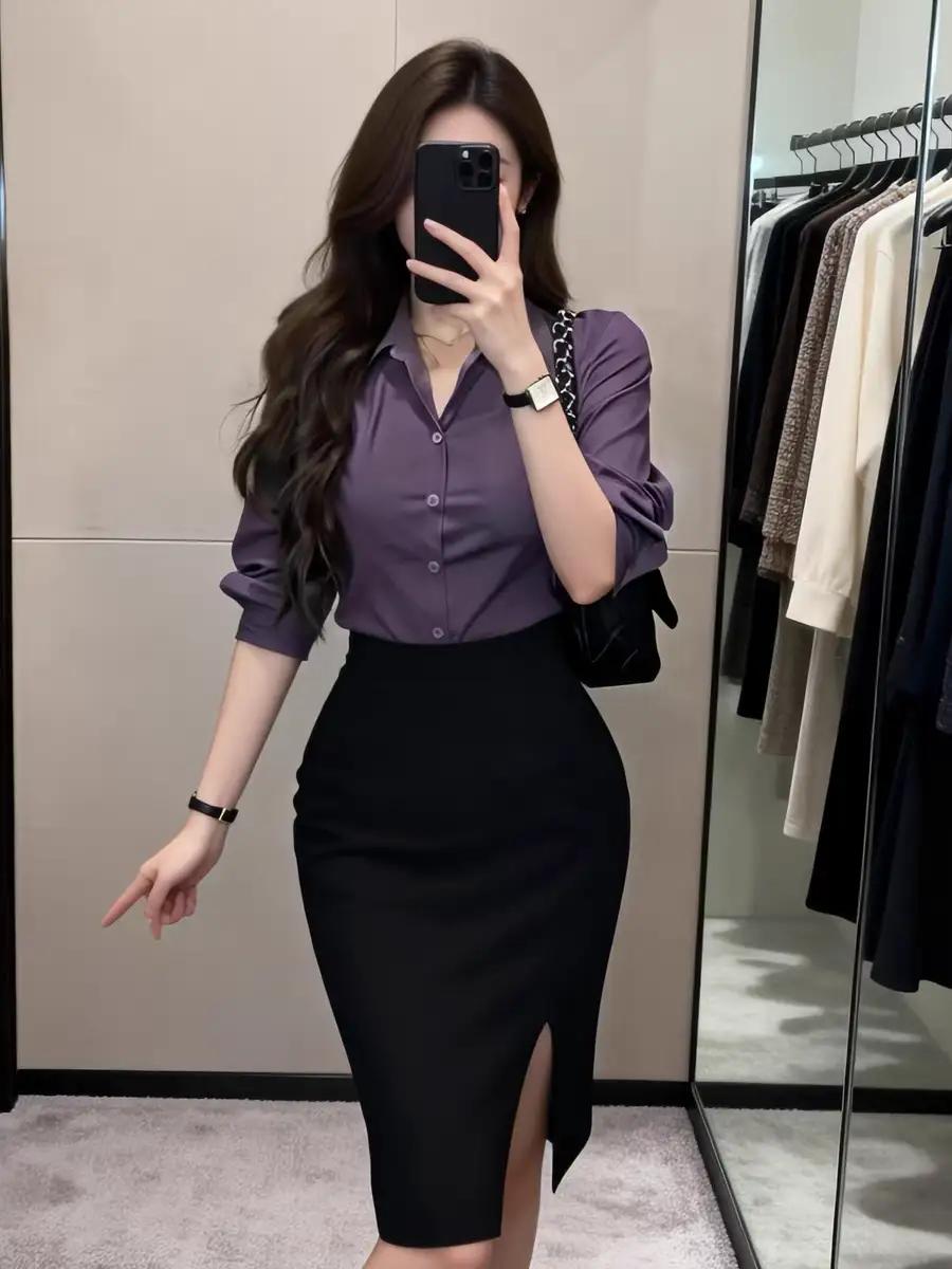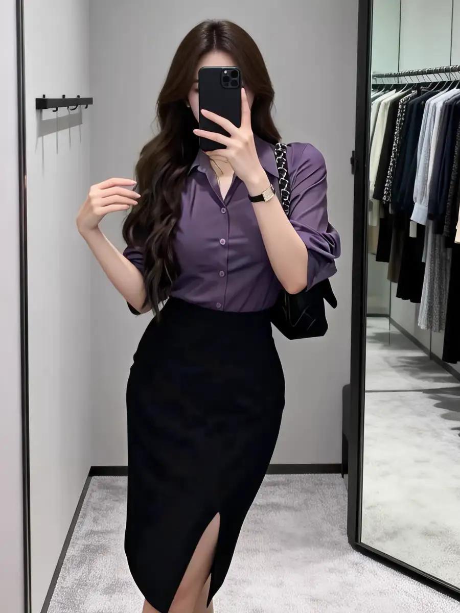 优雅紫色衬衫搭配黑色高腰裙,完美职场穿搭!💄👠