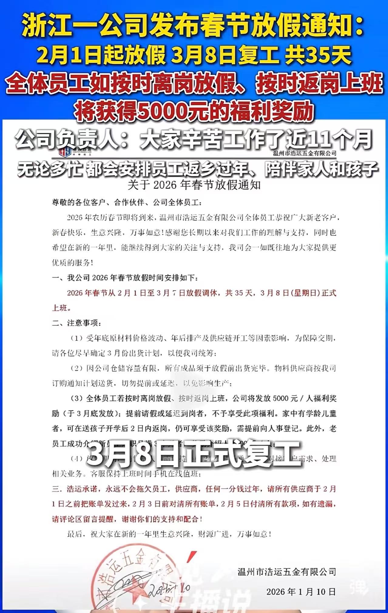 怪不得这家公司能发财 !浙江温州,一公司春节放35天!公司负责人:员工按时离岗,返岗上班,将获得5000元的福利奖励!大家辛苦工作了近11个月,无论多忙,都会安排员工返乡过年,陪伴家人和孩子。”网友:发给老板了,老板让我滚! 在浙江温州,有家公司最近火了——不是因为赚了多少钱,而是因为它干了一件让打工人集体破防的事:春节放假整整35天! 从2月1日放到3月8日,横跨整个正月,连元宵都过完了才上班! 更绝的是,公司还放出话:只要按时返岗,每人直接奖励5000元! 这笔钱3月底到账,但如果你提前请假、或者拖到年后迟迟不归,对不起,奖金没你的份。 不过,公司也特别人性化:家里有娃要上学的员工,可以等送完孩子开学后再晚两天回来,照样拿5000块——只要提前跟人事打个招呼就行。 公司老板张先生说,他们厂办了十多年,外地员工占大多数。“大家一年辛辛苦苦干了快11个月,图啥?不就图过年能踏踏实实陪陪父母、抱抱孩子吗?” 他说得实在:“钱是赚不完的,但家人的团圆,错过一次就少一次。” 结果呢?员工们不但没人“躺平”,反而干劲十足。 “老板真心对我们好,我们哪好意思摸鱼?平时抢着干活,就怕对不住这份信任。”一位老员工笑着说。 如今,这家企业订单不断、口碑爆棚,客户都说:“你们厂的人做事靠谱!”——人心稳了,生意自然旺。 消息一出,网友彻底炸锅: “我转给我老板看,他回我两个字:‘滚!’” “这才是真正的‘以人为本’!不是挂在墙上,是发到卡里、放到假期里!” “别再说‘小公司给不起福利’了——人家也是民企,也没上市,凭啥就能做到?因为老板心里装着人!” 这家公司能发财,真不是运气好,而是老板把“人”当人,而不是“人力成本”。 在这个连年假都要抠抠搜搜、动不动就“自愿加班”的时代,一家民营企业敢放35天假,还倒贴5000块请员工回家过年——这不是“宠员工”,这是顶级的商业智慧! 它看透了一个真相:员工不是机器,是活生生的人;而忠诚和效率,从来不是靠打卡机压出来的,是靠尊重和温暖换来的。 你给员工多一天陪伴父母的时间,他就给你多十分安心工作的态度;你在他心里种下一份被善待的感激,他就在岗位上还你一百倍的责任感。这才是真正的“良性循环”——不是画大饼,不是搞狼性,而是用实实在在的假期和真金白银的奖金, 告诉每一个打工人:“你值得被好好对待。”这样的企业不成功,天理难容。愿这样的老板越来越多,愿打工人不再只敢在评论区喊“羡慕”,而是有一天,也能骄傲地说:“我们老板,也这样!”