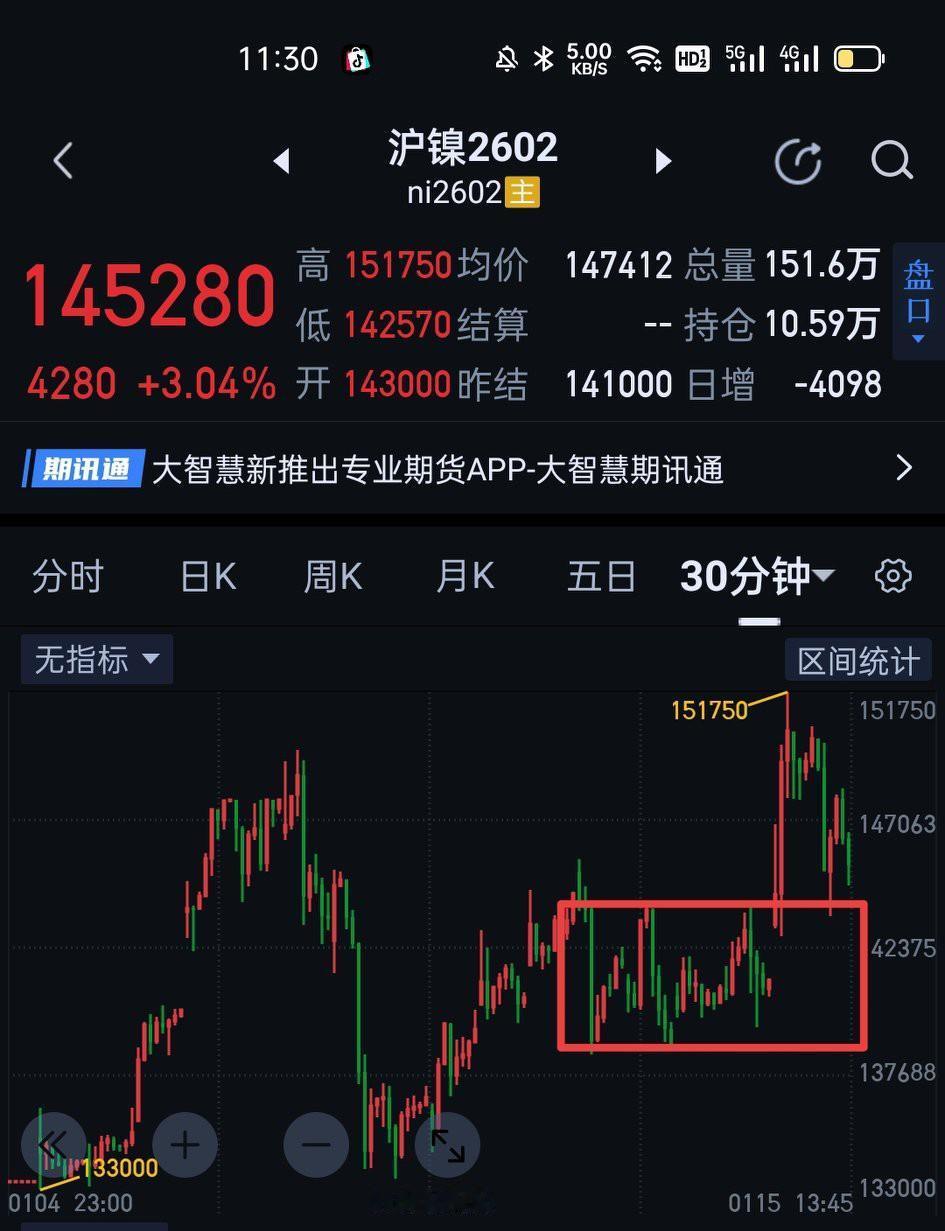 沪镍2602昨天夜盘选择了向上突破中枢,这样日线一笔上的结构仍然保持。上午展开的回调回到了下面的中枢,显示夜盘发起的多头攻势略有纠结,下午要观察143330能不能有效站稳。站稳后面走势还可稍有期待,但也暂只能当反弹去看,防止行情最终止步于151750下方。站不稳,昨夜的高点会围绕中枢形成盘背,昨夜新高的努力怕是会功亏一篑、草草收场。严重后果可导致日线上的终结,这是后话。