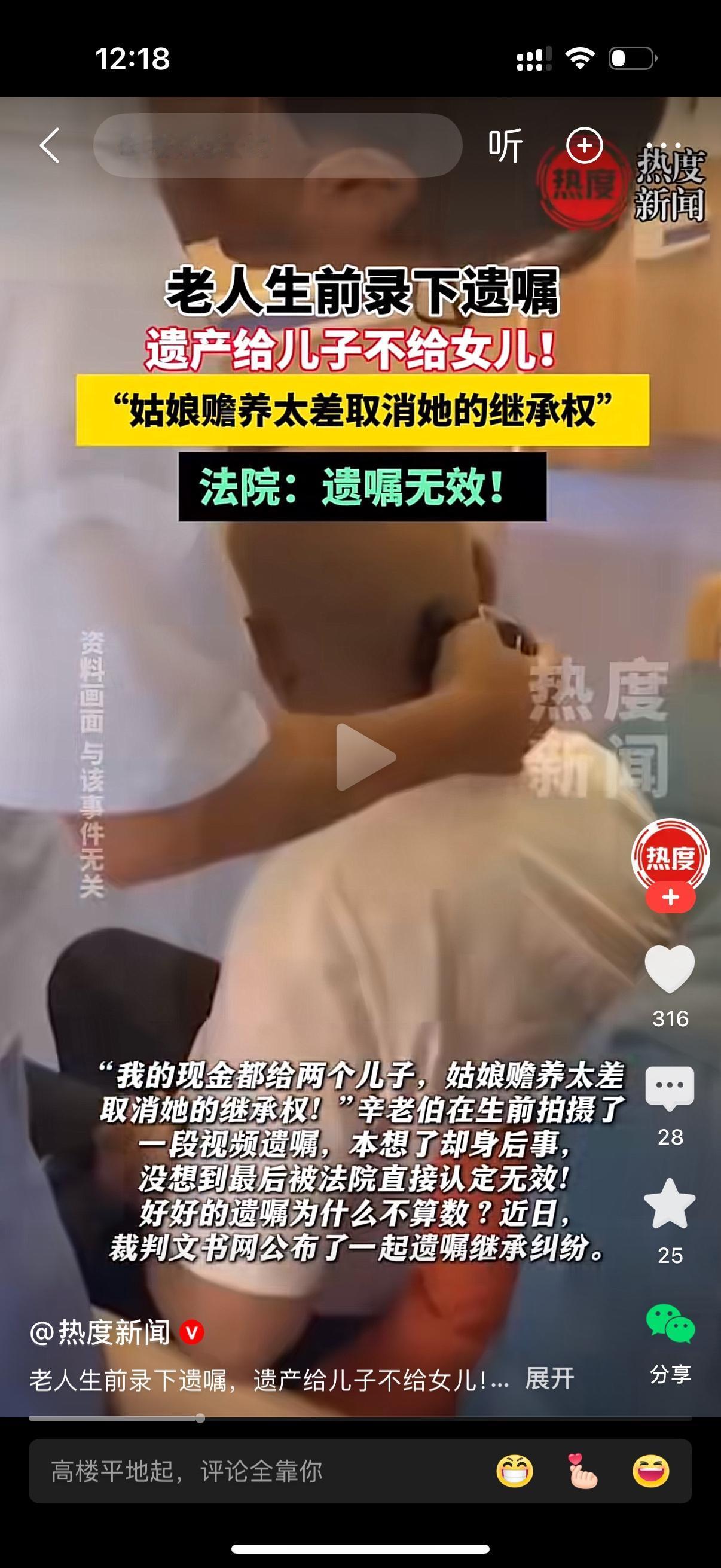 老人生前录下遗嘱,遗产留给儿子不给女儿。老人在视频中口述称,今天要立遗嘱,遗嘱内容是把我手里剩余的现金留给两个儿子,女儿没有。原因是两个儿子赡养我期间对我特别好。女儿赡养期间对我特别不好,使我身体受到特别大的伤害,导致我卧床不起,我取消她的继承资格。可这份遗嘱最后被法院判决无效。理由是视频录制过程只有大儿子有视频陈述,其他5位见证人都没有面向镜头陈述自己的身份,姓名及录制时间。真是怪了,女儿本就没有继承权,有了遗嘱都无效。