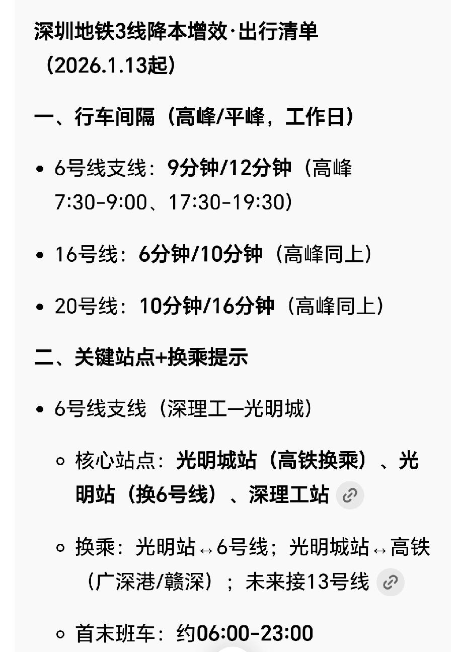 降本增效!深圳地铁三条线路也要关停扶梯了,发车间隔时间拉长了,看来地铁真是昂贵的交通基础设施! 1.自2026年1月13日起,深圳地铁6号线支线、16号线、20号线同步实施“拉长行车间隔+部分扶梯分时段关停”的降本增效措施,核心是运力匹配客流、减少无效能耗与运维成本。 2.背后原因:三条线路客流强度偏低(如20号线仅0.22万人/公里·日),运力与客流不匹配,以此优化资源、控本增效。