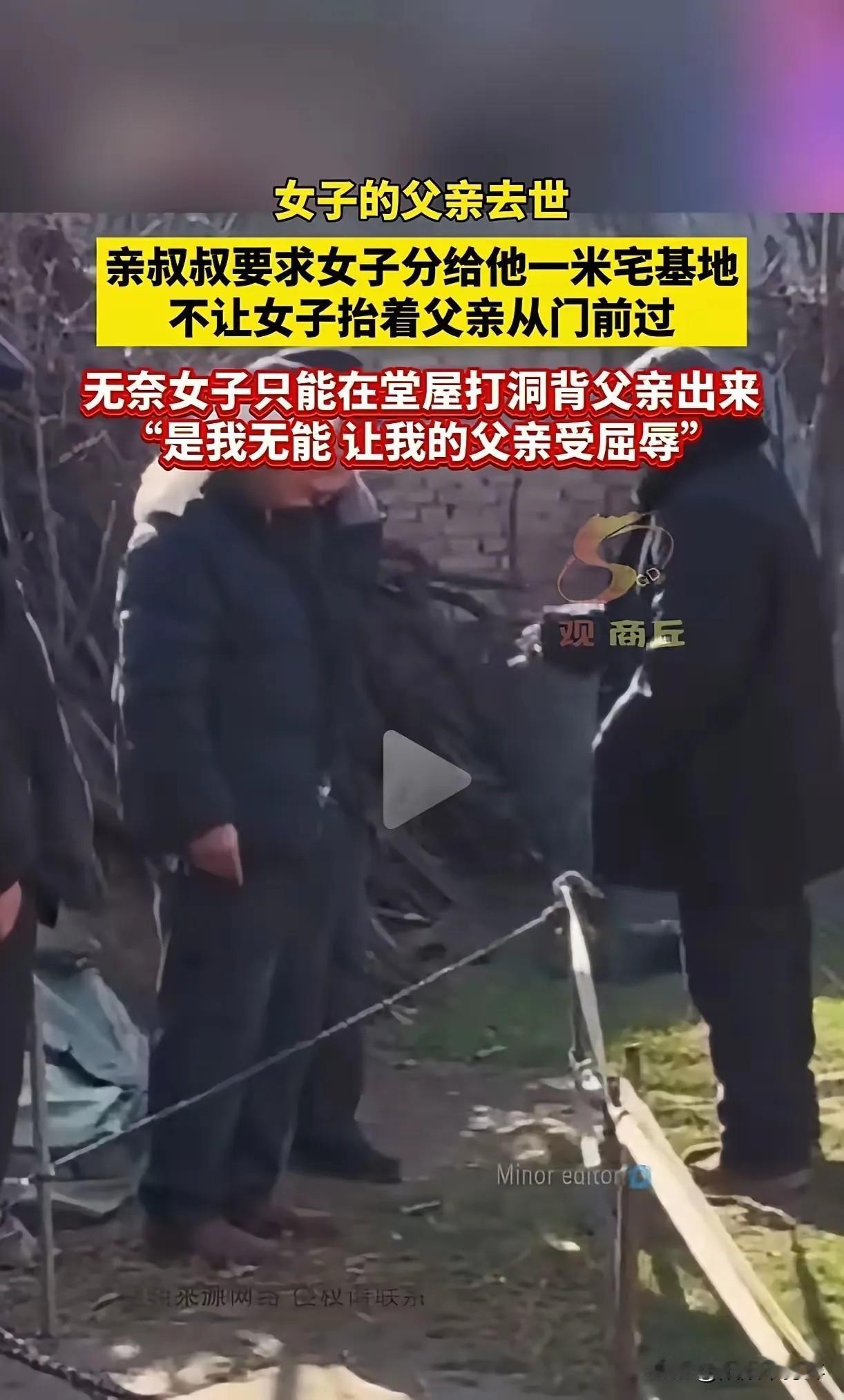 女子父亲去世,亲叔叔趁火打劫要求分给他1米宅基地,否则出殡不能从唯一通道即其叔叔门前过。侄女无奈只好把堂屋打洞背父亲出来。 灵堂里的香还烧着,女子跪在父亲遗像前,手攥得死死的,眼泪混着纸钱灰,糊了一脸。 父亲刚走没几天,她还没从难过里缓过神,亲叔叔就找上门找茬了。 就因为老宅的宅基地挨着叔叔家,他非要侄女让出来一米地,不然就不让出殡的队伍从自家门前过。 要知道,那可是出村的唯一一条路啊! 女子哭着去求叔叔,话刚说出口,就被叔叔狠狠怼了回去:“地不分,想从我门前过?门儿都没有!” 村里的老支书、族里的长辈都来劝,可叔叔油盐不进,直接搬了根碗口粗的木头横在路口,叉着腰站在旁边,摆明了要硬拦。 看着那根冷冰冰的木头,再看看灵堂里父亲的遗体,女子心里堵得慌,疼得连气都喘不匀。 她心里跟明镜似的,叔叔就是瞅准了她现在难办,想趁火打劫占便宜。 可她不能让父亲走得不安生啊! 实在没辙了,有邻居小声提议:“要不,就在堂屋墙上打个洞,从后院绕出去吧。” 女子咬着牙,点了点头。 当锤子第一下砸在砖墙上的时候,她蹲在旁边,眼泪噼里啪啦往下掉,每一声“哐当”响,都跟砸在她心上一样。 没多大功夫,墙上砸出了一个只能容下一个人过的小洞,冷风顺着洞口灌进堂屋,吹得灵幡哗哗晃。 女子戴上孝布,小心翼翼地背起父亲的遗体,一步一步慢慢从破洞里挪出去,嘴里一遍又一遍念叨:“爸,是闺女没用,让您受委屈了……” 周围的邻居看到这一幕,全都红了眼眶,有人当场就忍不住骂:“这叫什么叔叔!自家侄女遭难,不帮就算了,还往死里坑!” 这事很快就在村里传开了,连镇上的村委会和司法所都惊动了。 工作人员一上门,先查了宅基地的权属证明,当场就跟叔叔把话挑明了:宅基地归谁,法律上写得清清楚楚,不是他想抢就能抢的! 紧接着又严肃告诉他,拦着别人给亲人出殡,不光是坏了良心、违背公序良俗,更是涉嫌侵权,真要闹到打官司的地步,他绝对没理! 一听这话,刚才还横得不行的叔叔,瞬间就蔫了,赶紧把横在路口的木头搬开,低着头跟侄女道歉。 可这声道歉,来得太晚了! 父亲的出殡仪式总算是顺利办完了,但堂屋墙上的那个破洞,就像一道疤,刻在了女子的心上,怎么也抹不掉。 在农村,宅基地的纠纷确实不少见,可再大的利益,也不能丢了良心啊! 一米宅基地,看着事小,可它寒了多少亲人的心? 血浓于水的亲情,难道真的比不上这一尺一寸的土地吗? 如果你是这个侄女,遇到这种狠心的叔叔,你会选择原谅他吗?