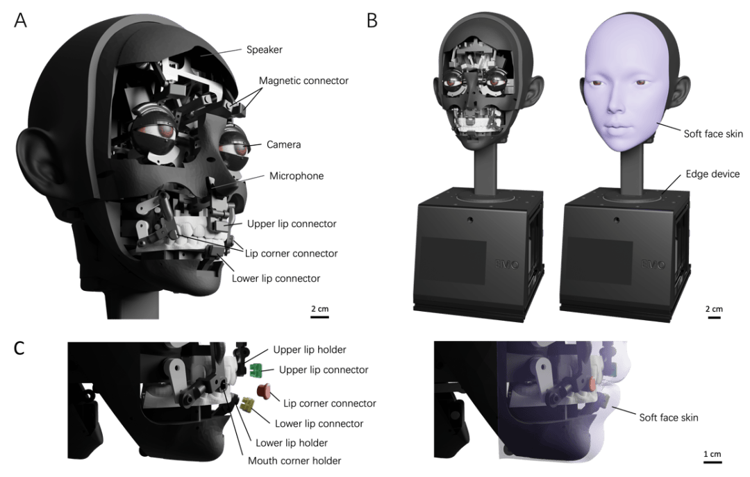 图2.机器人唇形硬件结构。(A)面部机器人设计概览,重点展示了人机交互关键组件:包括扬声器、麦克风、高清摄像模块,以及用于固定柔软硅胶面皮的磁吸式快拆连接器。该连接器能实现面皮的精准定位,并通过推拉双向运动驱动硅胶面皮,完成说话时所需的复杂唇部动作。(B)搭载柔软硅胶面皮的人形机器人外观展示。其底座内部集成有边缘计算设备。(C)唇部驱动系统特写,展示上唇、下唇与唇角连接器分别对应固定于相应唇部支架。柔软可替换的面皮通过磁吸连接器固定,可便捷拆卸以进行维护或个性化调整。