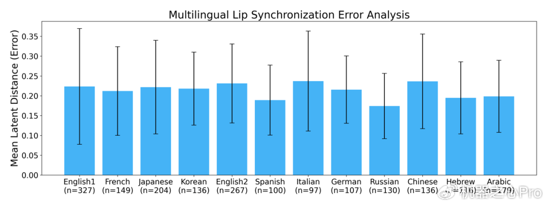 图5.多语言唇语同步性能量化表现。x轴标签下方标注的样本量n对应每种语言的测试句子视频帧数。结果表明,所有非英语语言的同步误差均保持在英语误差范围内,显示出稳健的跨语言泛化能力。