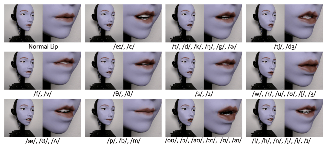 图3.机器人能实现的口型及其对应音标展示。该机器人展示了再现关键英语音标的能力,例如爆破音(/p/和/b/)、双唇音(/m/)以及圆唇元音(/u/和/o/)。通过独立控制上唇、下唇及嘴角,每帧图像均捕捉到其实现的典型唇部运动效果。这些数据为机器人在说话时实现正确的唇形匹配奠定了基础。