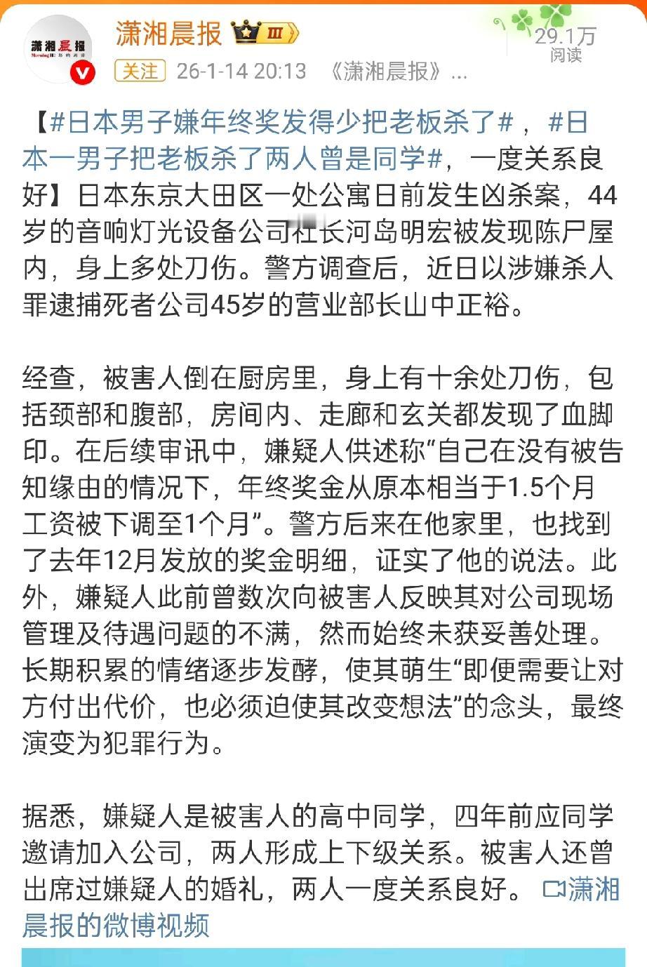 日本男子嫌年终奖发得少把老板杀了。 连刺老板十多刀将其杀害,二人是高中同学,关系