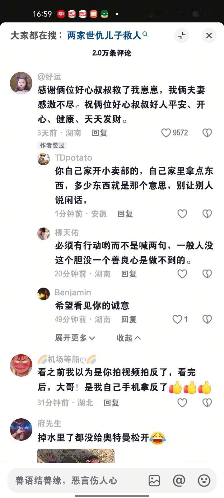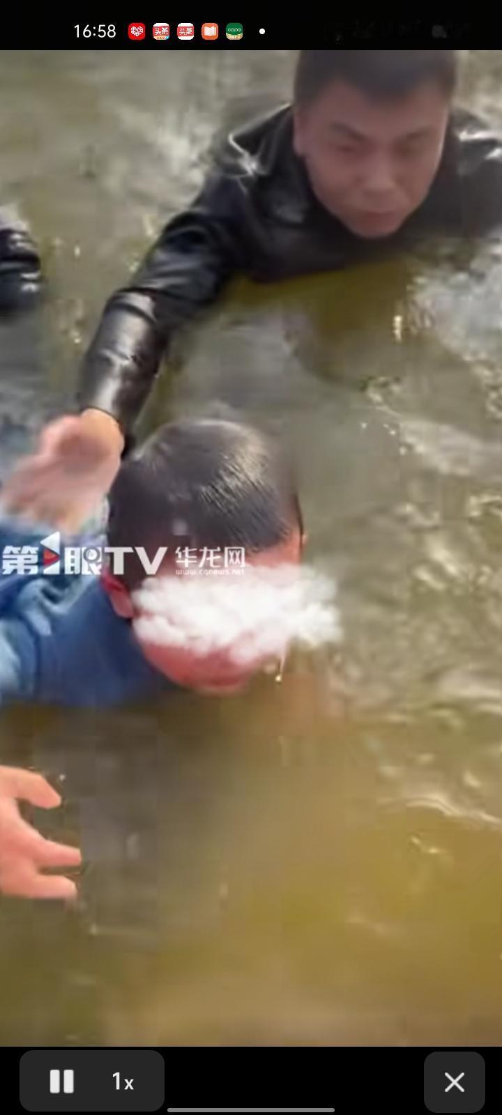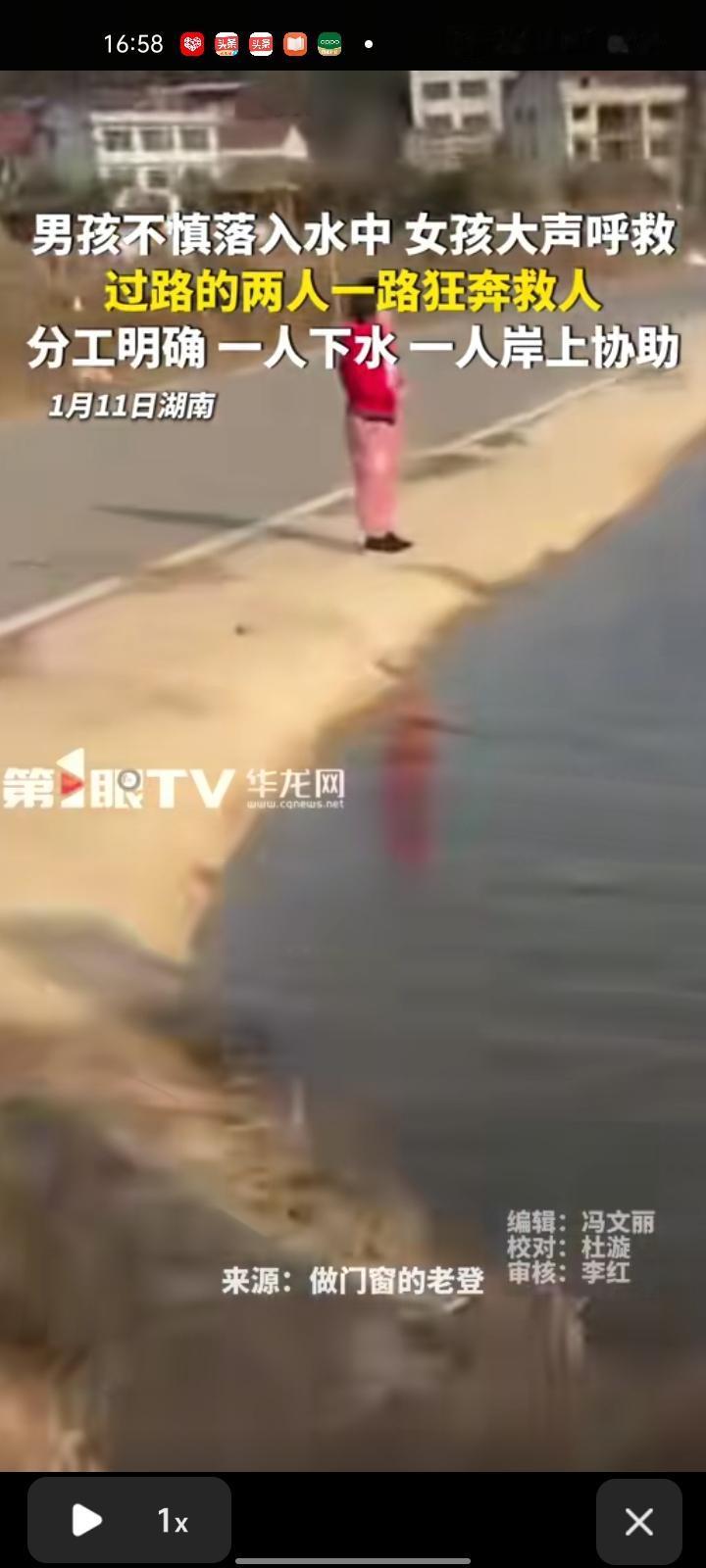 1月11日,邵阳市新邵县。一男孩掉入水中,女孩大声呼救,过路的两人一路狂奔救人,两人分工明确,一人下水,一人岸上协助。男孩救出来后,孩子家长在评论区表达感谢