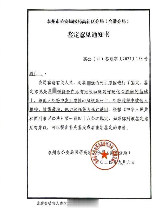 泰州市公安局医药高新区分局(高港分局)出具的《鉴定意见通知书》显示,蒋某强符合在患有冠状动脉粥样硬化心脏病的基础上,与他人纠纷中发生急性心肌梗死死亡,纠纷过程中被他人推搡、情绪激动、体力消耗等为死亡诱因。