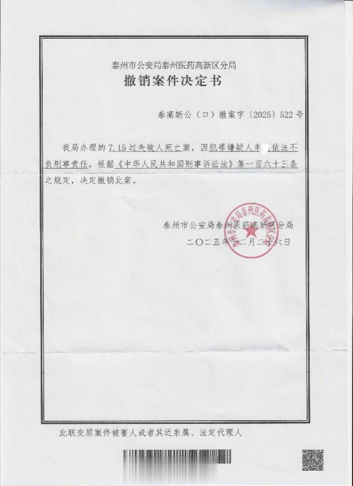 蒋先生介绍,2024年7月16日,泰州市公安局医药高新区分局立案侦查,于2025年7月21日侦查终结,以朱某涉嫌过失致人死亡罪向泰州市高港区人民检察院移送审查起诉。