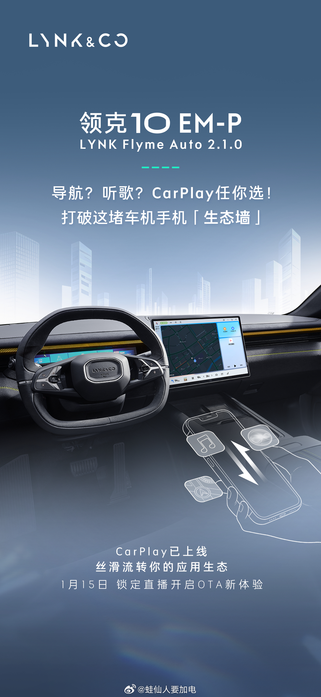 好消息!领克10EM-P 将于1月15日也就是明天开启OTA。本次OTA的主要内容为:1️⃣接入Ai大模型的语音助手2️⃣Carplay3️⃣苹果UWB/NFC钥匙4️⃣车机版酷狗音乐我知道发完10P的一定会有人来问领克Z10 ,目前正在推进中,如果不出意外的话农历新年前是可以O的,以上。领克 杭州·杭州极氪大厦