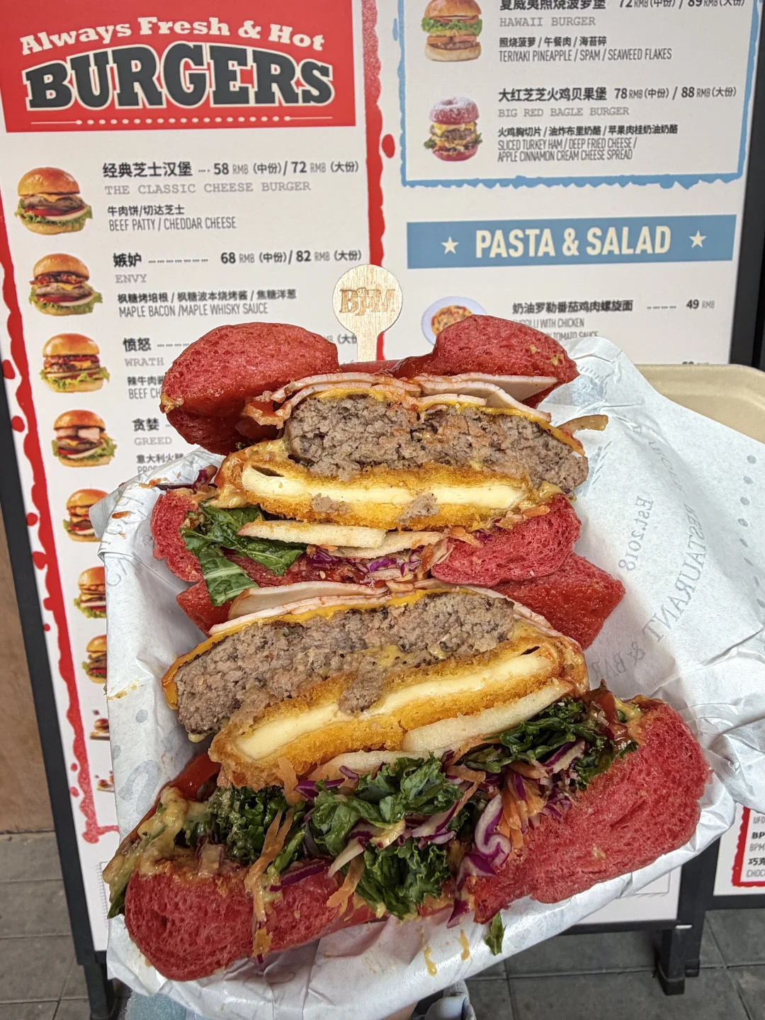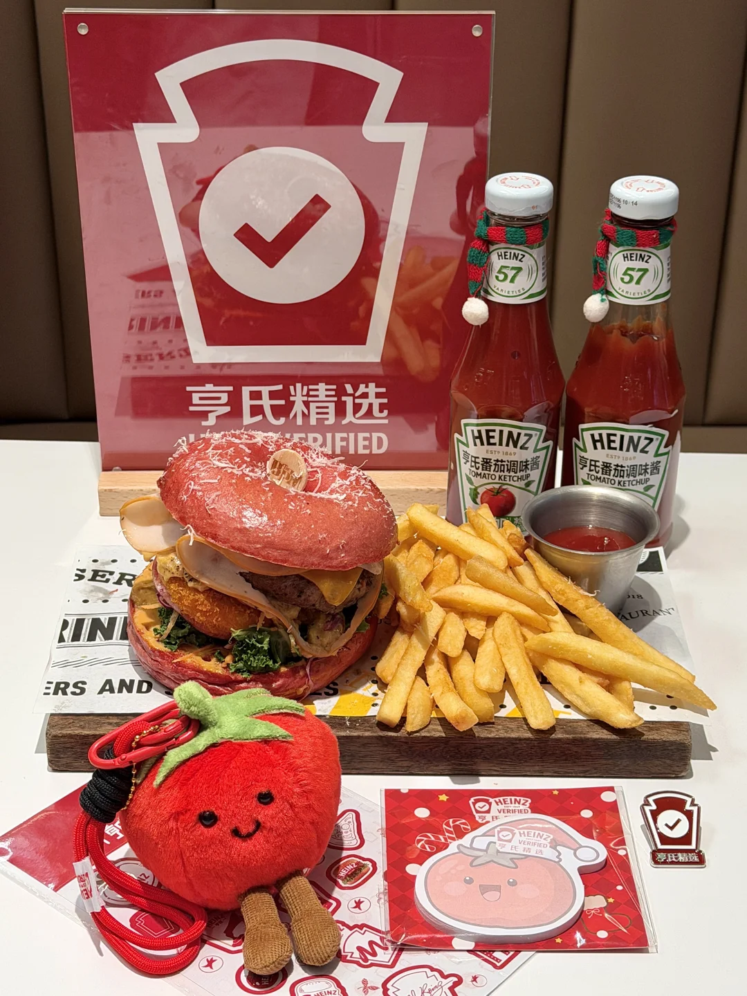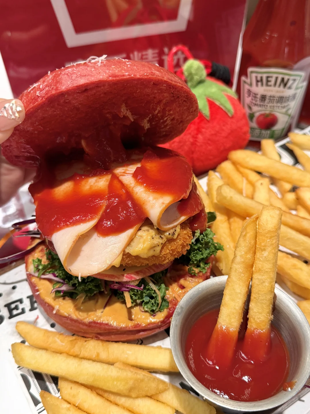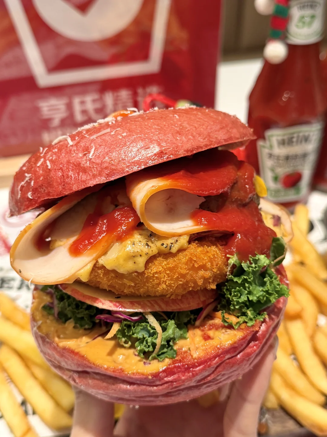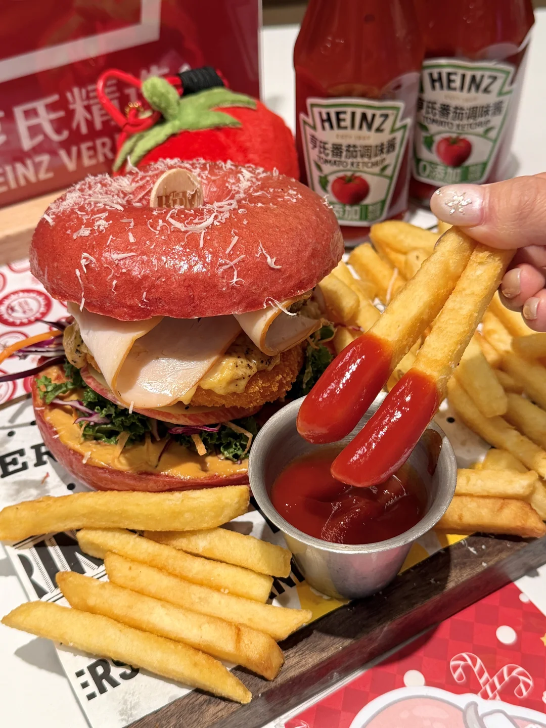 终于吃到了!亨氏精选圣诞汉堡pk赛的亚军! 之前真的很害怕排队!这次特意工作日来吃真的有被惊艳到!🥹🥹大红芝芝火鸡贝果堡,红贝果煎得脆脆的!整个汉堡真的满满都是料!里面夹着大片的火鸡肉和双重芝士,还有特调的苹果肉桂酱🤤口感真的好丰富 再搭配着亨氏番茄沙司,它那种天然的酸甜番茄味不仅解了腻,还把肉桂的暖香和火鸡的鲜嫩衬得更清新~尤其是和苹果酱叠在一起吃,酸甜交织,果香层层递进! 一口下去好满足!😭😭 就在五一广场的📍The BPM(北正街店)