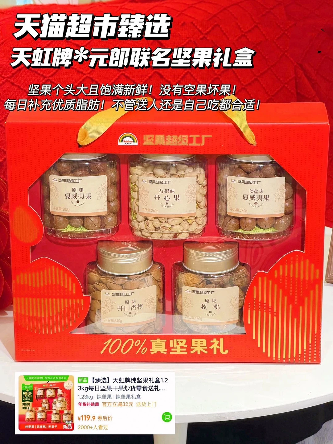 天虹牌和元朗联名的坚果礼盒足足1.394kg!每颗都饱满香脆!品质真的没得挑!独家包装礼盒也是天猫超市独一份!正好赶上年货节大促!还解锁了一堆臻选年货宝藏🎁
