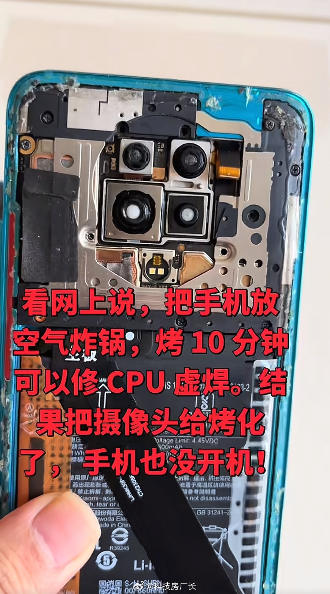 空气炸锅修手机CPU虚焊的正确做法1、拆下手机主板(摄像头也拆下)2、用铝箔纸把主板包起来,只露出CPU3、CPU朝上放入空气炸锅,200度十分钟4、冷却半小时再取出安装原理是CPU使用的低温焊锡,空气炸锅均匀加热,相当于重新植锡,成功率未知,高风险请勿模仿,P5是失败案例cr.楚楚自装日记