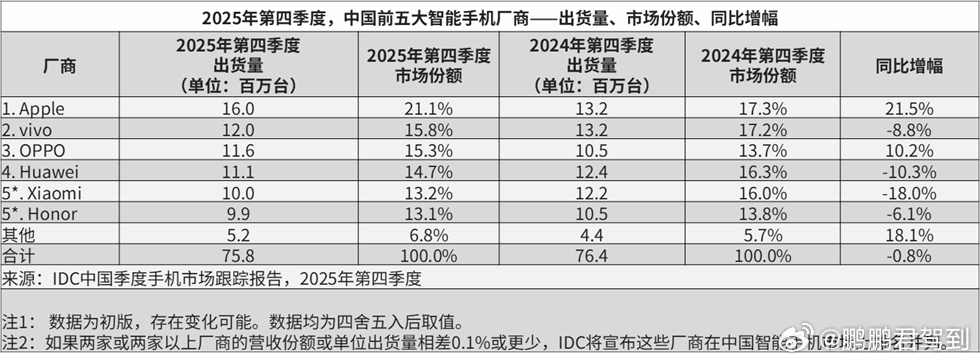 OPPO第四季度出货量实现了双增长!1月14日 ,国际数据公司IDC 发布2025年全球智能手机市场跟踪报告。 在中国市场,智能手机市场出货量约7,578万台,第四季度同比微降0.8%。OPPO 逆势增长,取得双位数增长的好成绩,同比增长达10.2%,是安卓阵营唯一增长的品牌。另外,全球统计数据显示,第四季度三星同比增长18.3%、OPPO 7.6%、苹果 4.9%。OPPO是第四季度中国头部厂商中唯一实现逆势增长的品牌。好产品自然有好口碑呀!