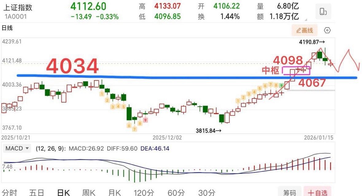 缩量1万亿,“人工降温”效果显著!后续怎么看? 周四大盘小幅震荡整理,收了根小十字星,意味着多空相对平衡,走势总体还是符合预期的,短线大概率横向震荡整理为主,5日线逐步靠拢10/20的一个过程。从周线的角度观察,也可当作是回踩确认4034的动作,目前来看走势还是处于合理的震荡范畴,且5周均线会继续向上发散,多头排列还在延续,所以大盘这个位置并不具备大跌的条件,横向震荡的概率更大,回踩只要不破4034就都可以接受。 所以,从周线,再到日线观察,走势就比较清晰了,只要能够维持小阴小阳结构的调整方式,且不破4034的条件下,就不用太担心。 震荡走势,对操作节奏要求比较高,不可过度激进,尤其是有“人工降温”的背景下,资金还是比较畏惧高度的,所以涨不去追,跌也没必要过度恐慌,买阴卖阳,把握好节奏即可。 具体细节收评再说! 个人观点,仅供参考!