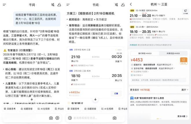 例如,用户可以让千问App帮助规划春节旅行计划。在预订机票的环节,用户可以输入“帮我订春节期间到三亚的往返机票,两大一小,三亚停留四天,出发时间是2月18日或者19日。”千问能够调用飞猪服务,综合分析春运票价走势,给出不同策略的航班方案。