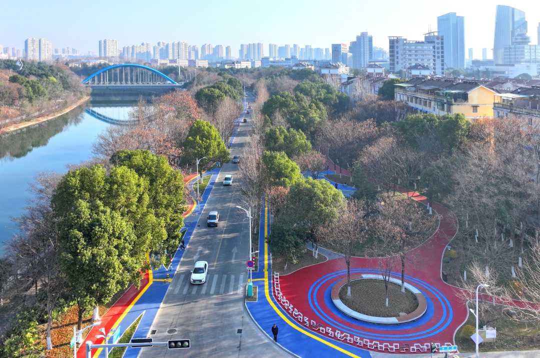 1月13日安徽省六安市天河东路公园,亲水风情绿道和城市楼宇相映成景。