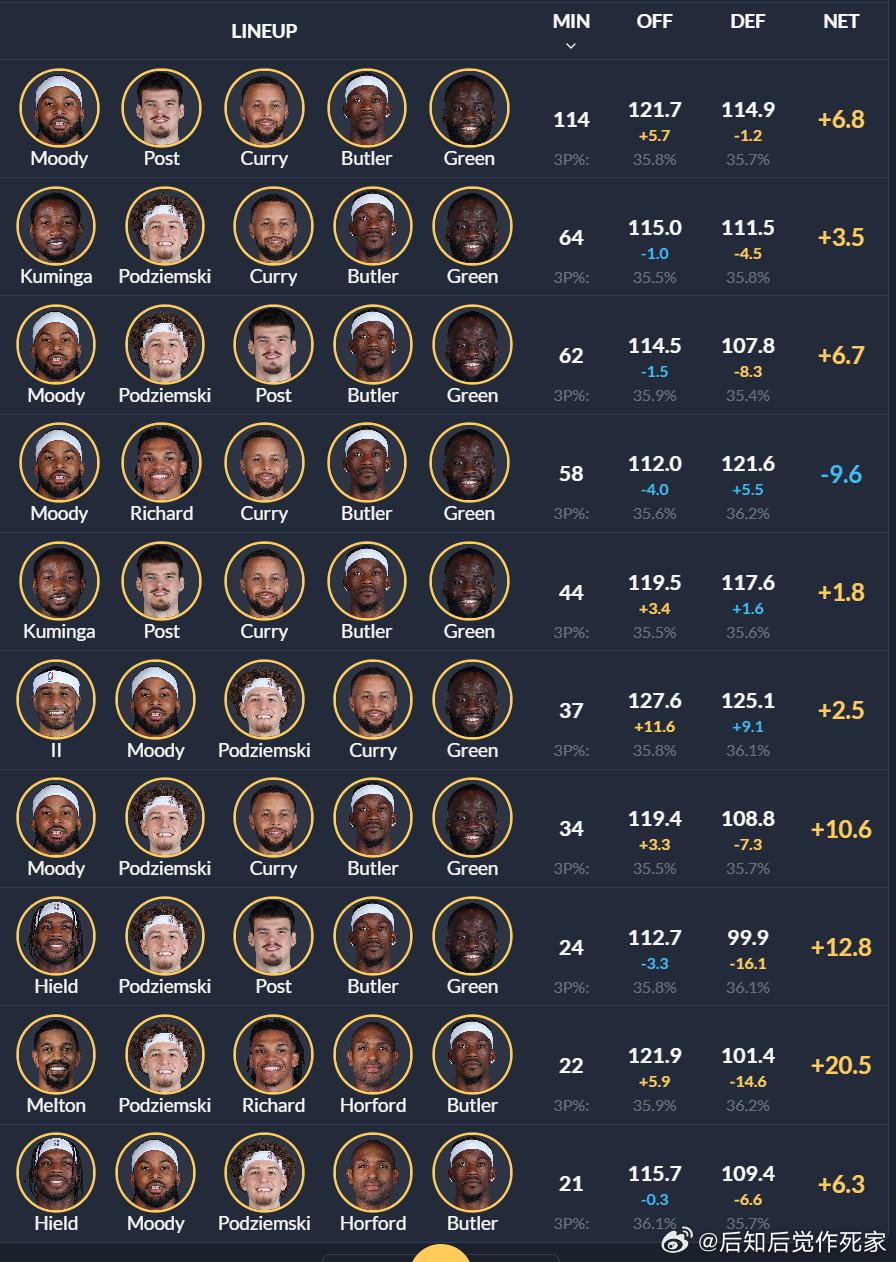 图1,前半程最赢分(实际打出的效果,包含投篮随机性)的阵容前十。图2,前半程用得最多(攻防三分都调整为联盟平均,即忽略投篮随机性)的阵容前十。金州勇士 赛季中想法