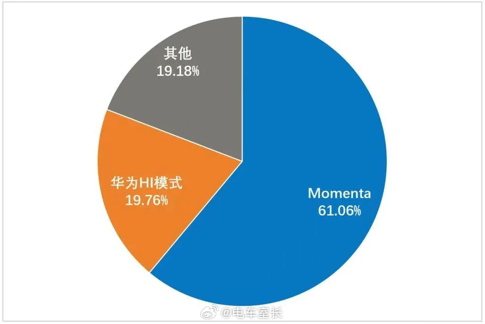 Momenta占NOA第三方市场61%份额第三方市场指的是非自研渠道里,Momenta已经占据了绝对的市场领先。报告数据显示,2025年1-11月,我国搭载城市NOA功能的乘用车累计销量达312.9万辆,渗透率已占乘用车上险量的15.1%。Momenta前11个月搭载量达41.44万辆,市场份额约占第三方供应商总量的61.06%。华为HI模式紧随其后,搭载量约13.41万辆,市场份额约19.76%。两者合计占据第三方市场超过八成份额。而在自研出货里,接下来最高以及越来越高的,应该还是乾崑智驾。