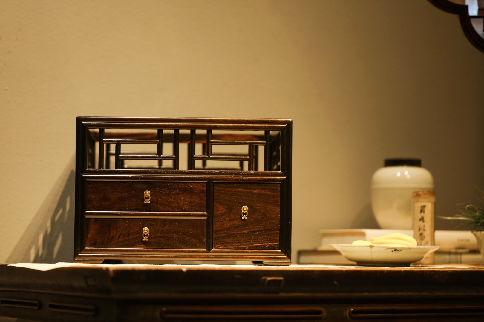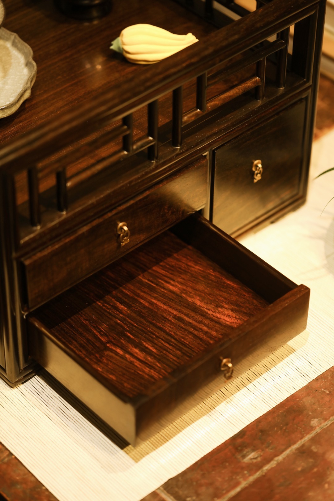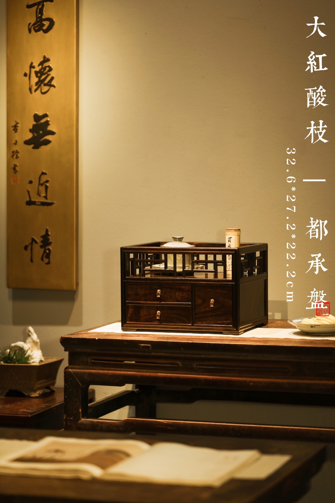 大红酸枝 | 都承盘/茶棚取材黑红老料、榫卯精工,一体同料制,上层围栏、精整疏透,下设三屉,做工精致,茶席收纳,美观实用。32.6*27.2*22.2cm 重4310g