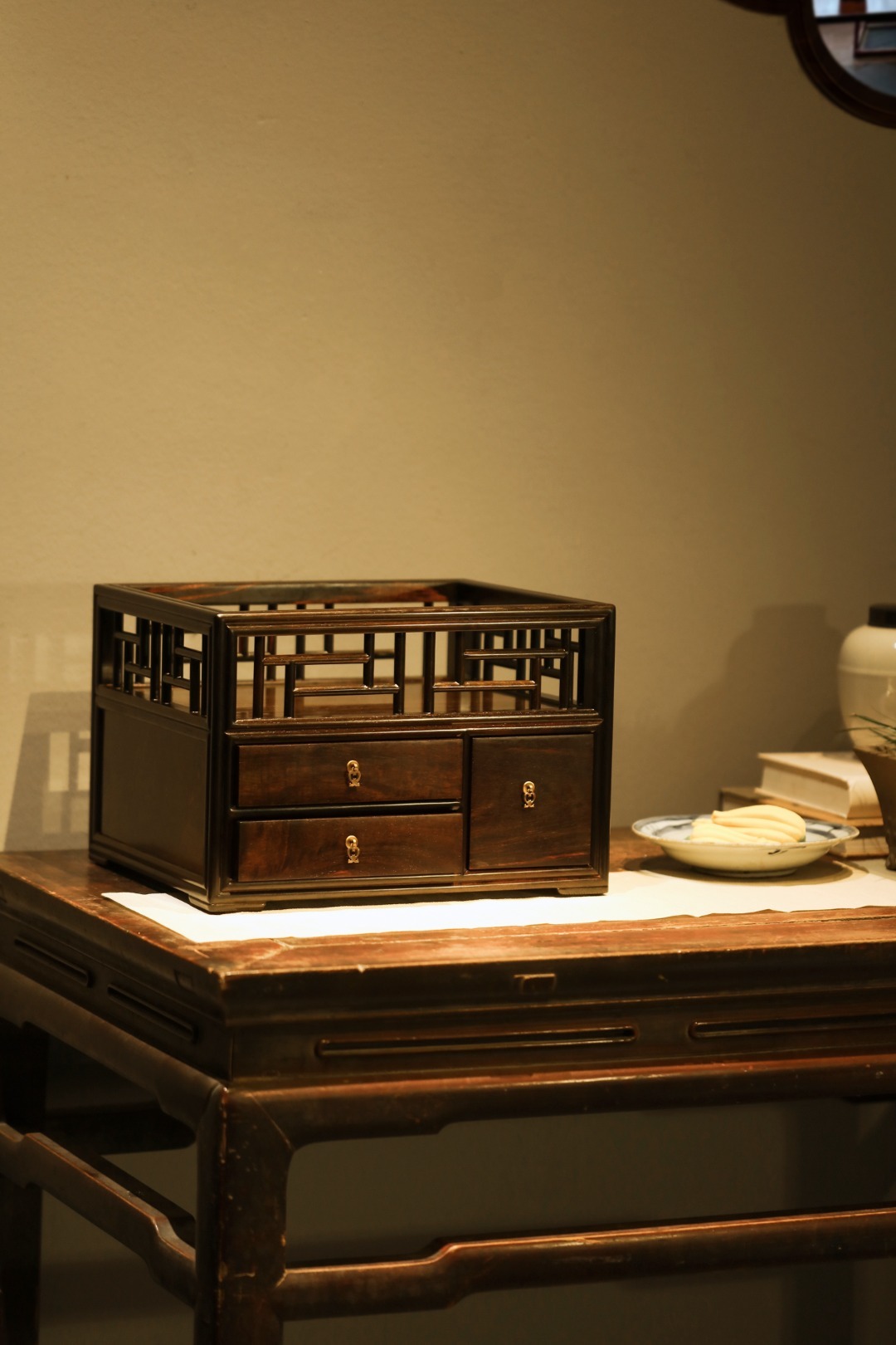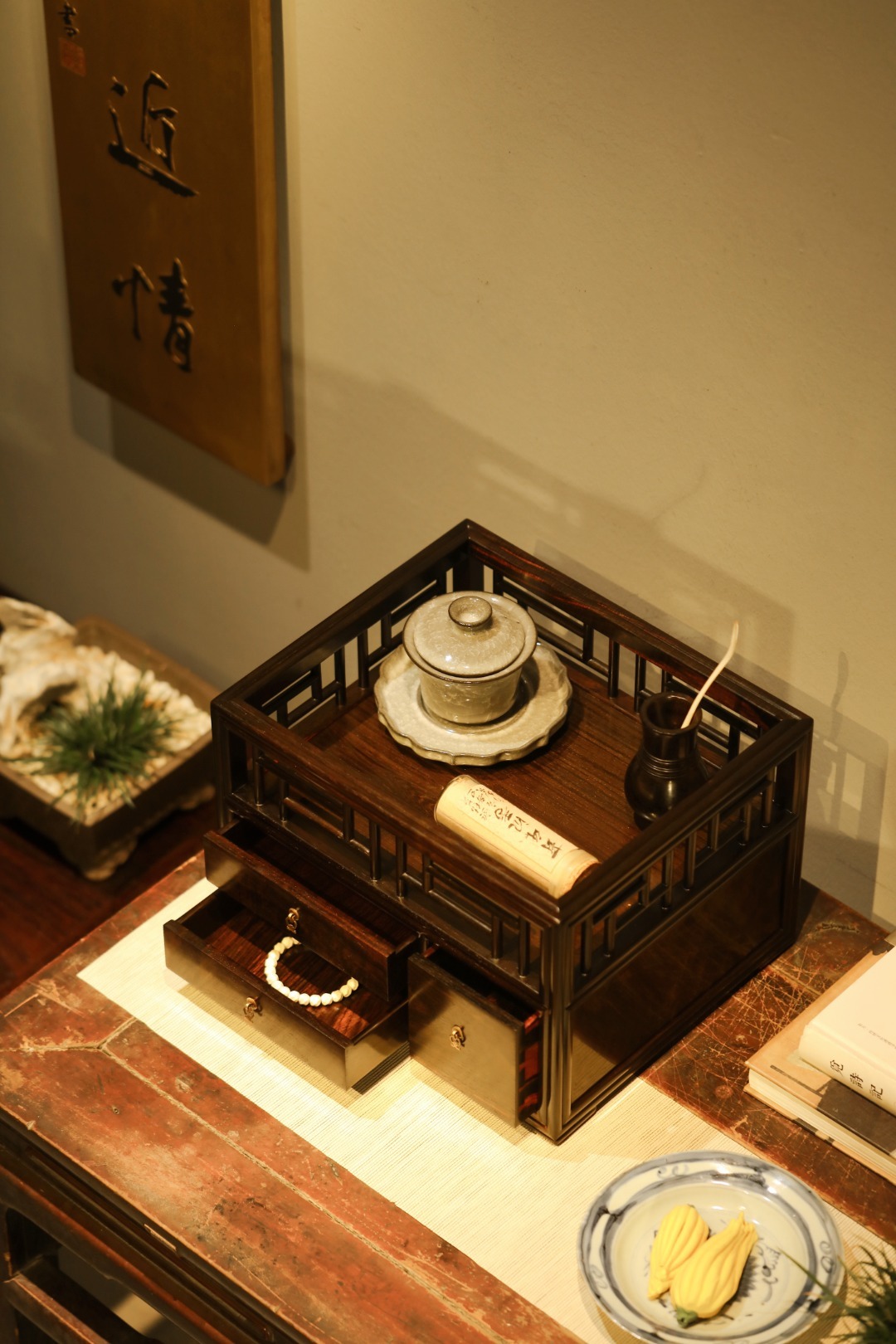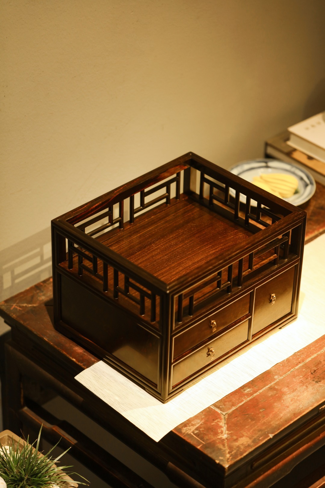 大红酸枝 | 都承盘/茶棚取材黑红老料、榫卯精工,一体同料制,上层围栏、精整疏透,下设三屉,做工精致,茶席收纳,美观实用。32.6*27.2*22.2cm 重4310g