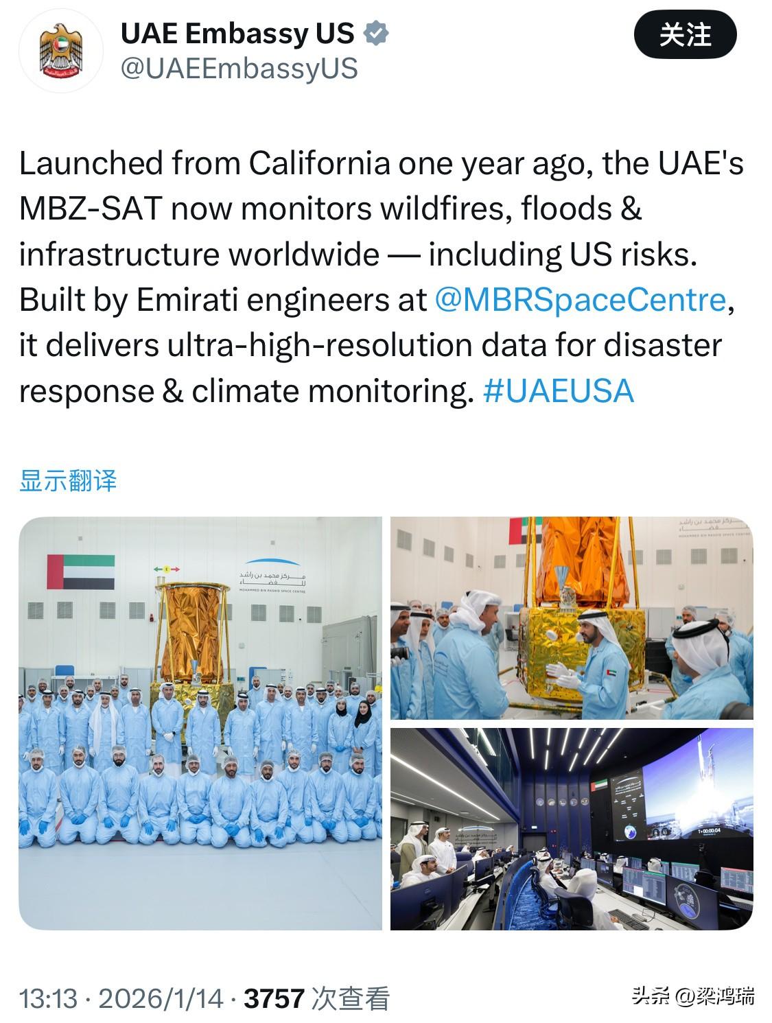 阿联酋的 MBZ-SAT 卫星是该国空间技术的里程碑,MBZ-SAT 卫星于 2025 年 1 月(一年前)搭载 SpaceX 的猎鹰 9 号火箭在加利福尼亚州范登堡太空基地发射升空。 研发团队:该卫星由位于迪拜的 穆罕默德·本·拉希德航天中心 (MBRSC) 的阿联酋工程师团队自主研发,是该地区目前最先进的商业卫星。 核心功能: 超高分辨率成像:其影像精度比之前的“哈利法”卫星(KhalifaSat)提升了一倍以上,能够提供极为清晰的地表细节。 环境与防灾监测:目前在全球范围内执行任务,重点监测野火、洪水等自然灾害,并评估关键基础设施的状态。 国际应用:其监测范围涵盖美国等地的灾害风险,为全球灾害响应和气候变化研究提供关键的决策数据支持。
