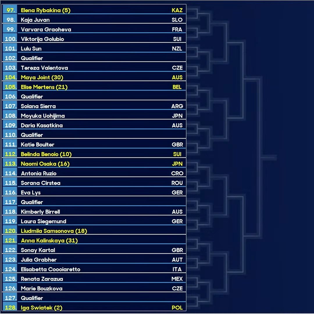 澳网抽签仪式 女单签表出炉🔥前八种子对位:萨巴伦卡 - 鲍里妮高芙 - 米拉·安德列娃佩古拉 - 阿尼西莫娃莱巴金娜 - 斯瓦泰克中国球员首轮对阵:王欣瑜 vs 资格赛选手张帅 vs [W]普雷斯顿澳网2026
