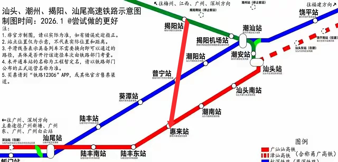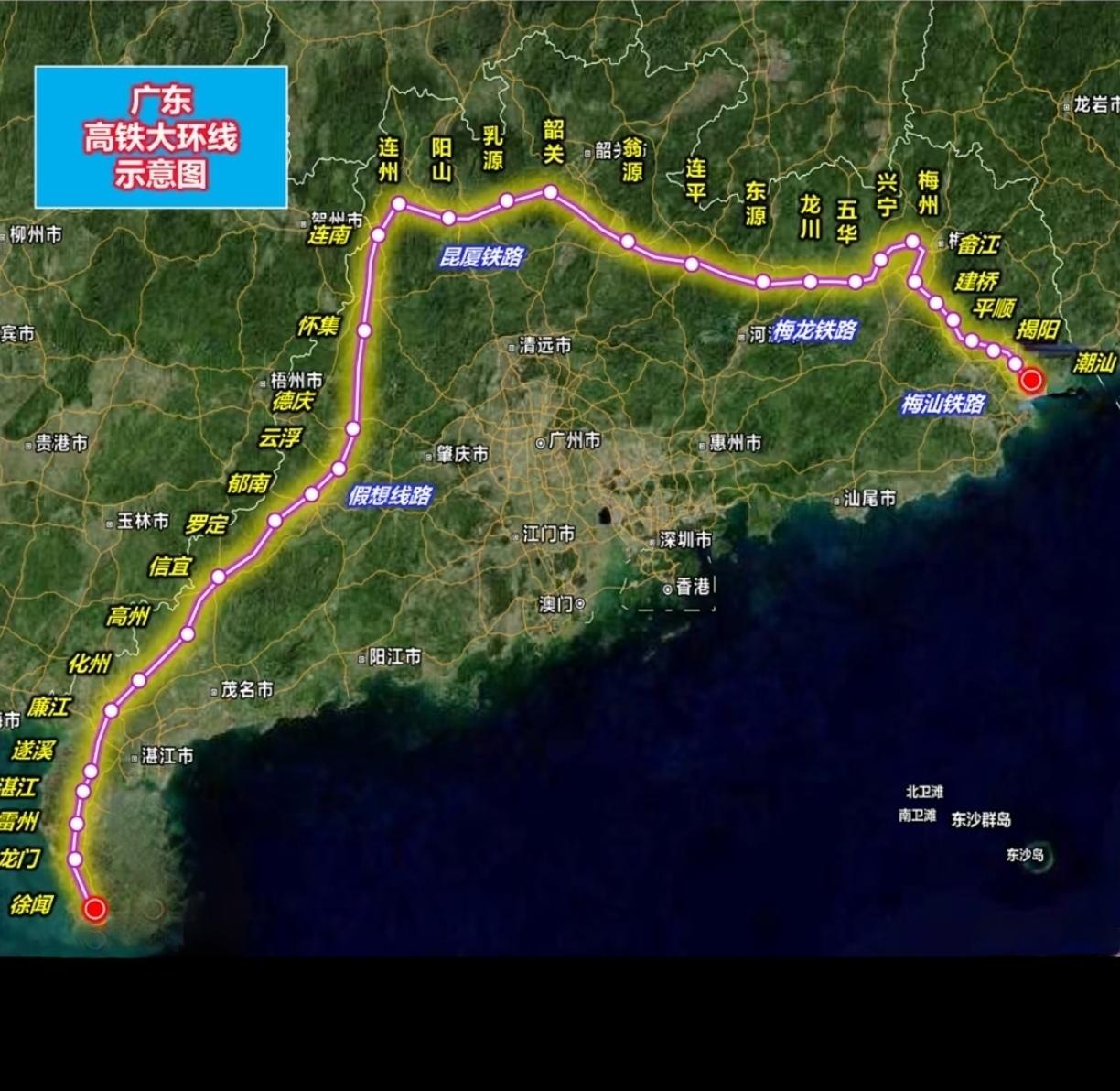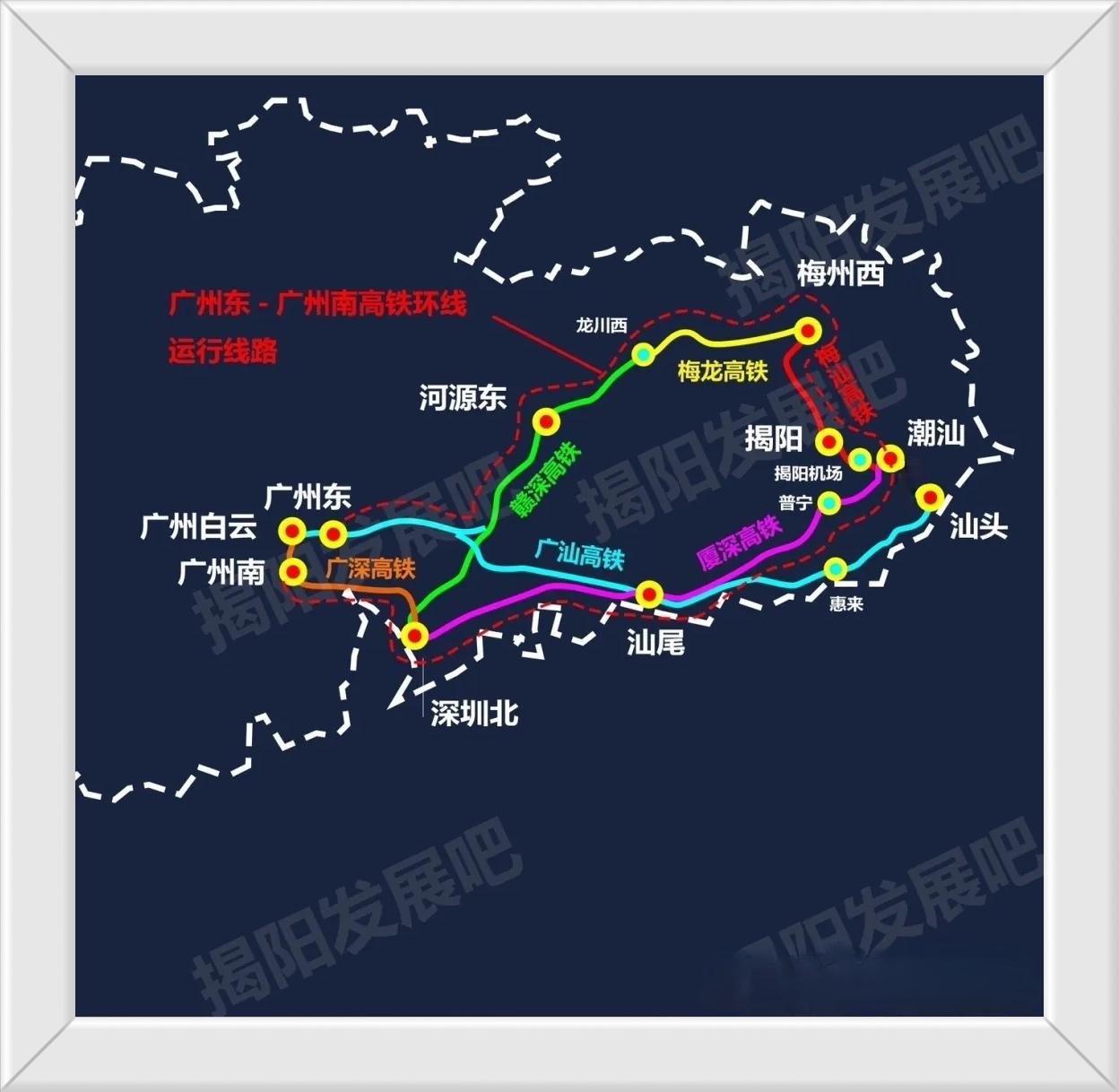 粤东三条运营高铁路线。 北向有时速250“梅汕高铁”。 东西向有时速250“厦深高铁”。 东西向有时速350“汕汕高铁”。 南北向有时速160“揭惠铁路”。 “揭惠铁路”串联二条时速250和一条时速350的高铁。 “揭惠铁路”串联三条高铁。从高铁《揭阳站》始发并与厦深高铁“普宁站”并站,也与汕汕高铁“惠来站”并站,终点站是粤东新城站。