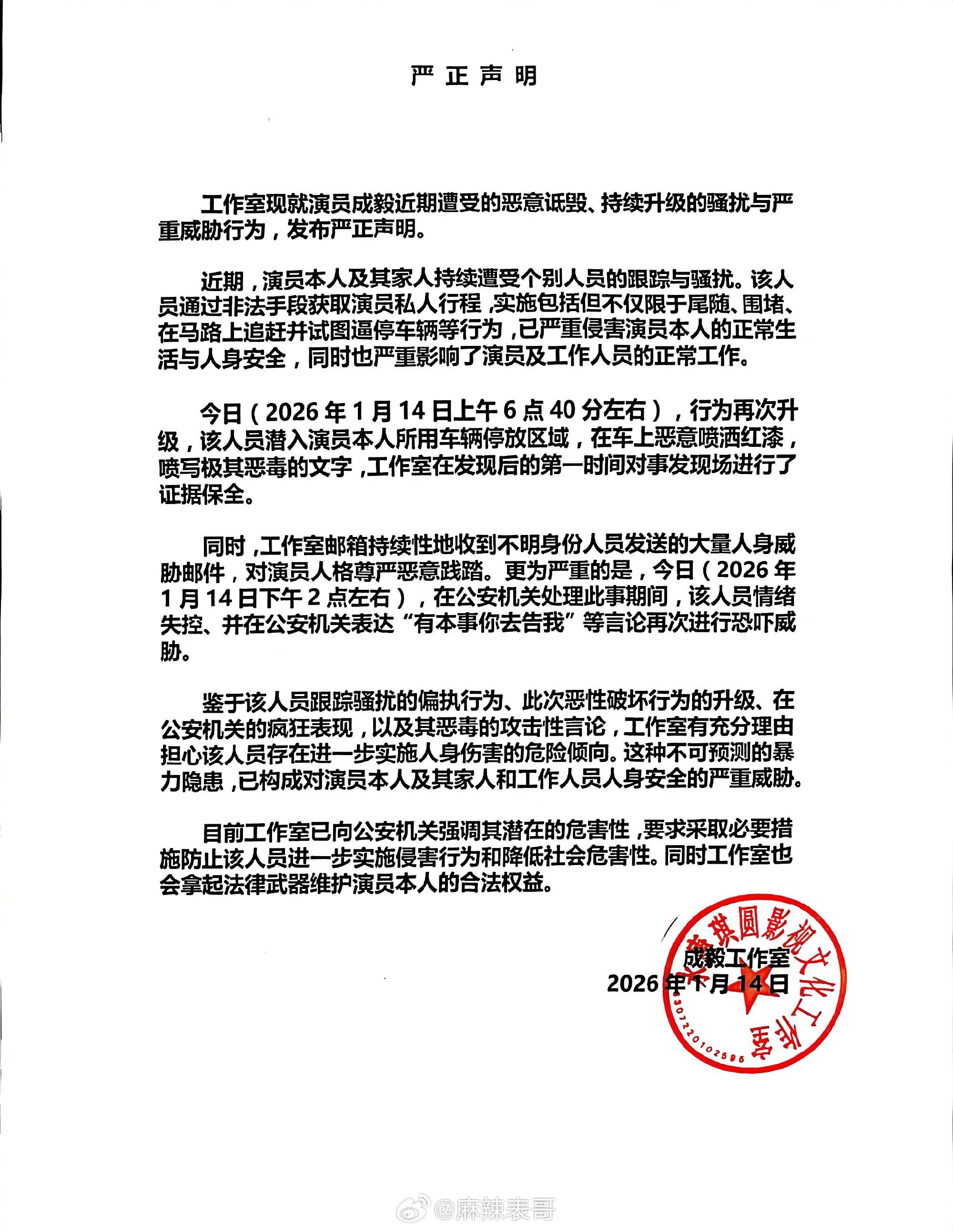 成毅发声明,说最近被跟车,车子还被用红油漆写了恶毒语言,配合调查的时候,该人员还