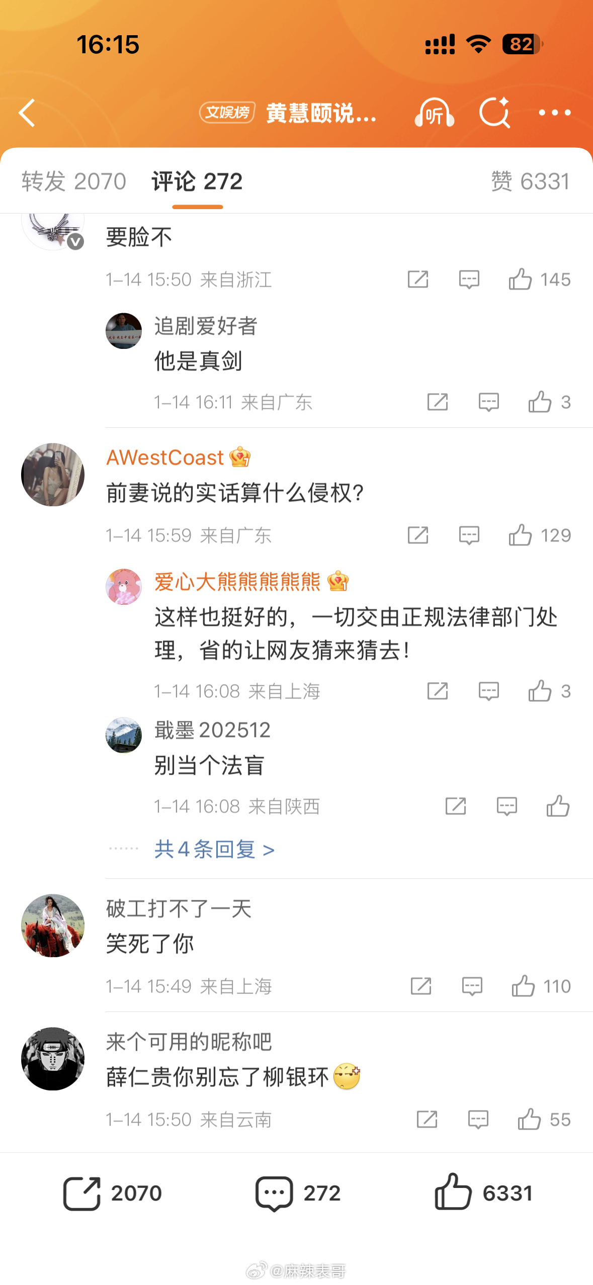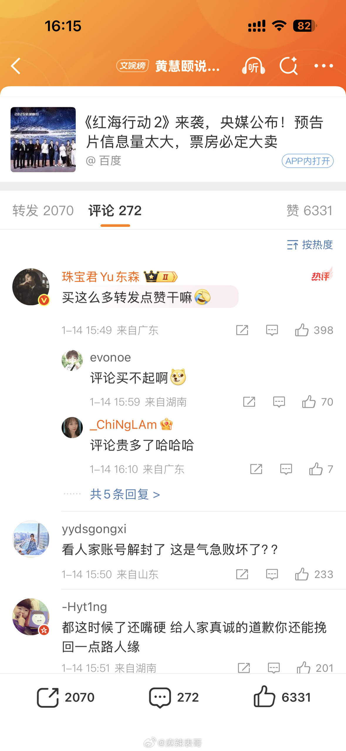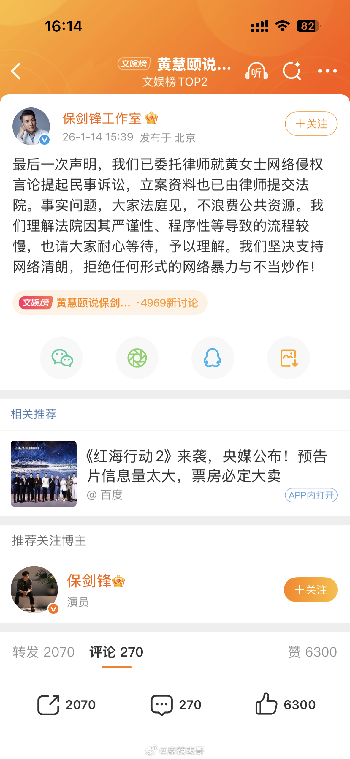 黄慧颐说保剑锋婚前出轨后,保剑锋工作室说「法院见」,表示会起诉黄慧颐。评论区都在