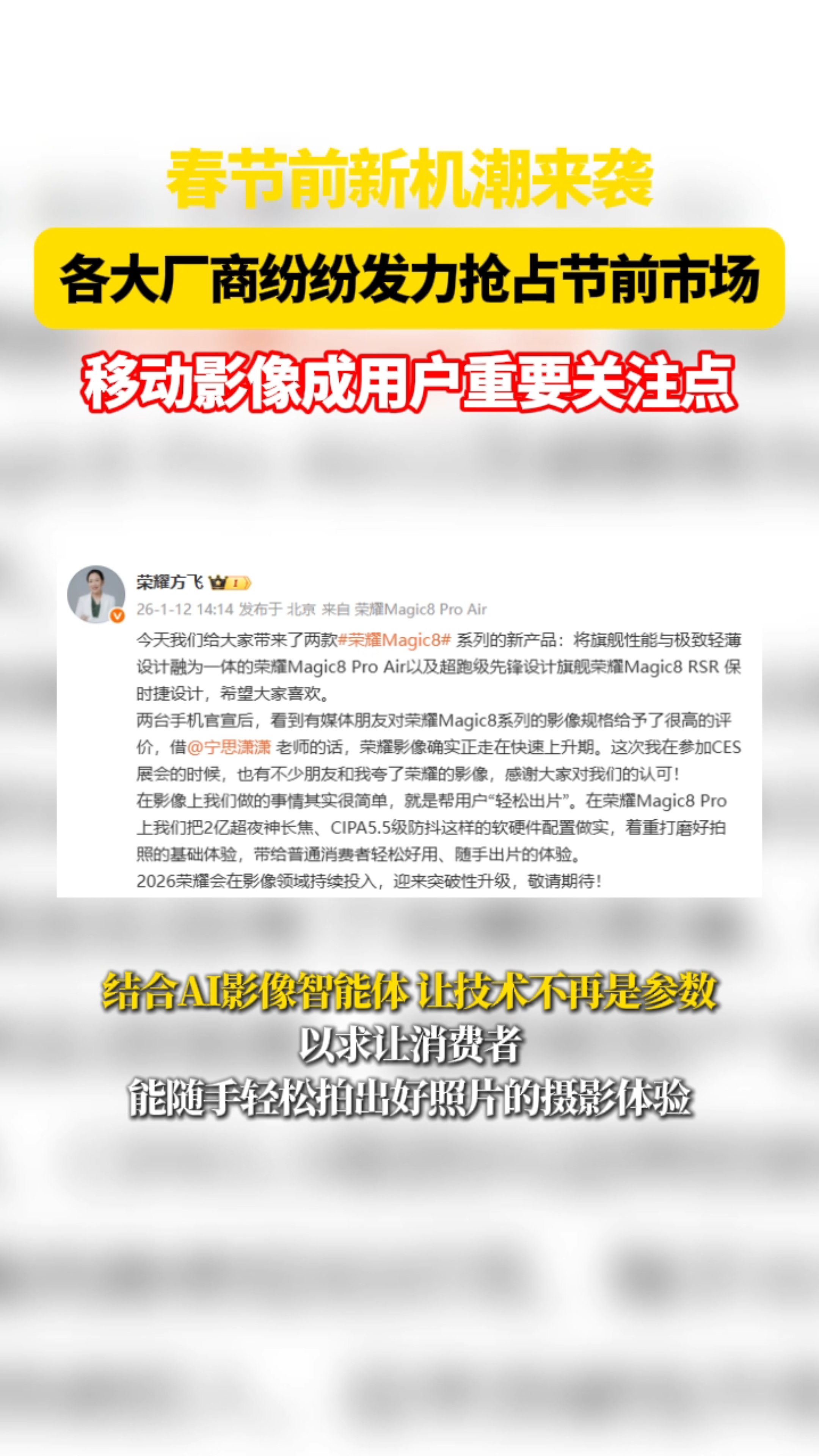现在手机卷影像已经成为一个趋势了,毕竟随着短视频的普及,大家日常拍照、拍视频记录生活的次数变多,影像体验的要求也越来越高。去年我用来拍得最多的当属是Magic8 Pro,就我个人而言,影像这块确实是“进步最大”的。明显能感觉到他们家在实打实的发力,2亿长焦、夜神镜头、CIPA5.5、AI MAGE等软硬件加持,从被大家吐槽影像不够出彩的短板遗憾一路走到业内和市场的双肯定。单从作为消费者的体验看,用方飞总的话来说,这步“普通人也能随手拍出大片”的方向属实是走对了的。春节前手机大厂最后一波冲刺 荣耀这次的双旗舰策略,估计会在数码圈引起一波不小的振荡。荣耀高管称影像迎来突破性升级