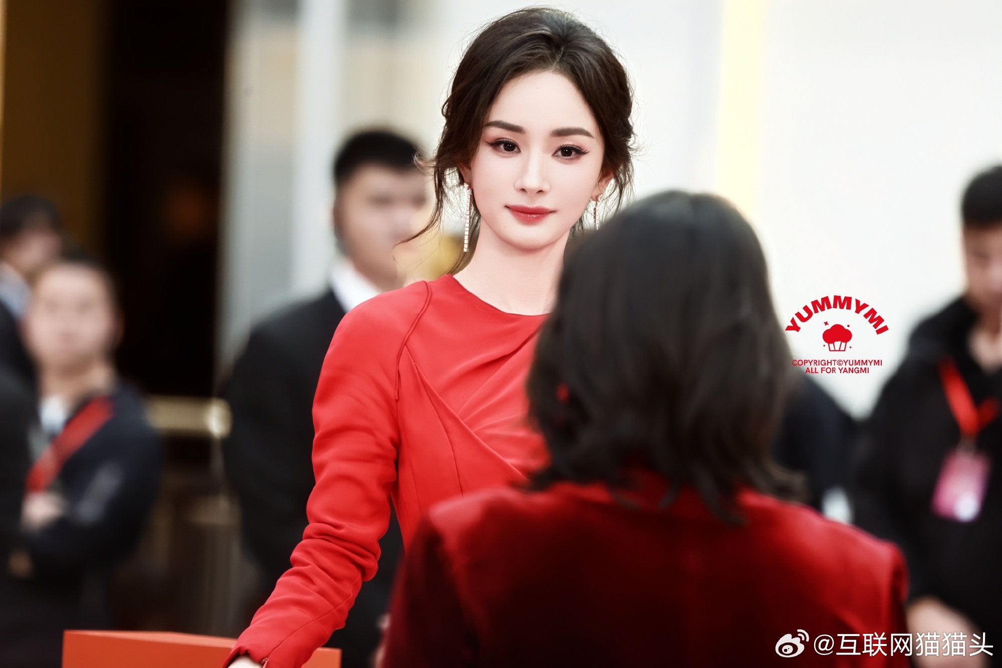 杨幂深圳活动路透一袭正红色长裙太绝了!修身剪裁勾勒曼妙曲线,利落造型衬得肩颈线条