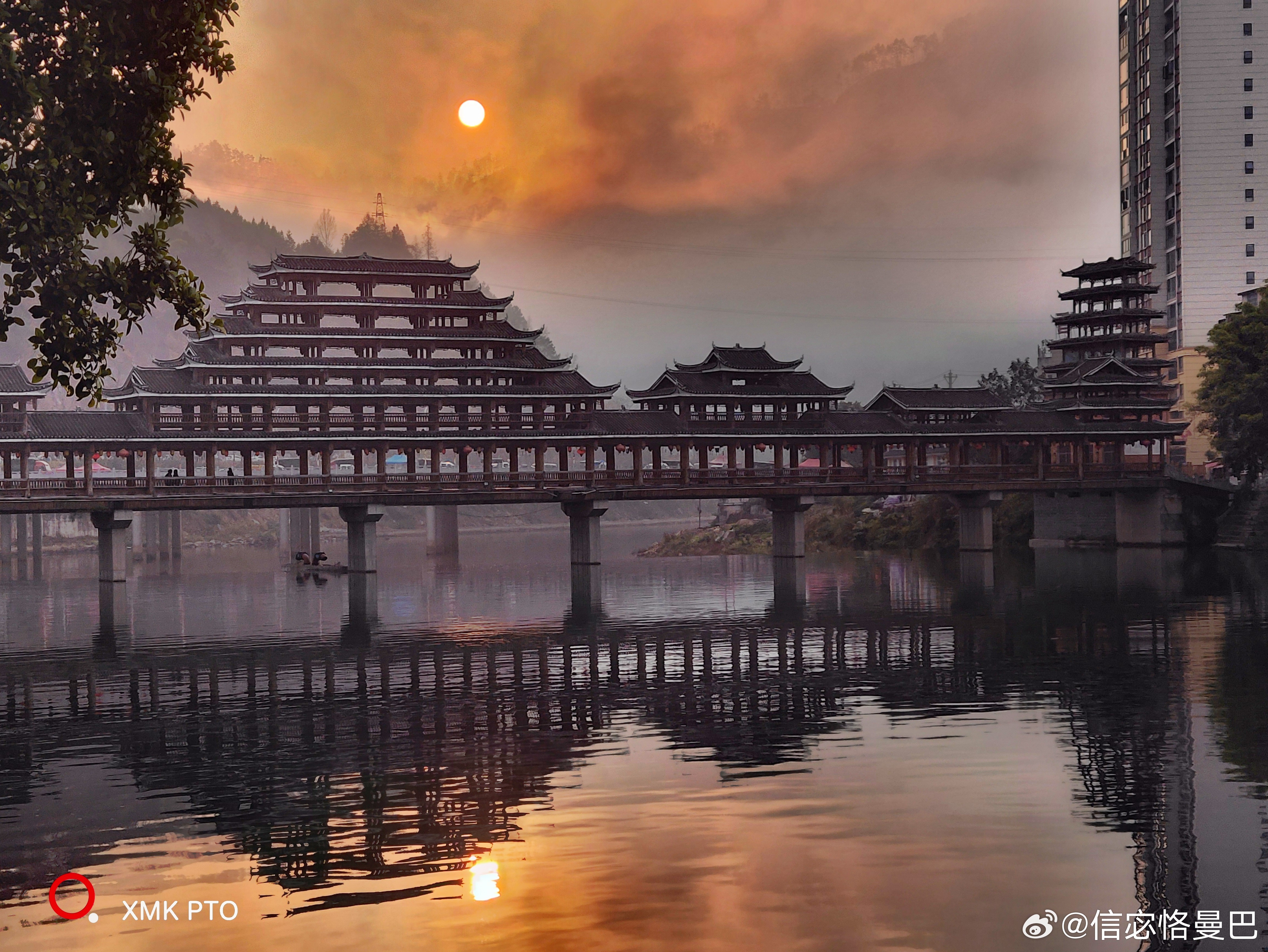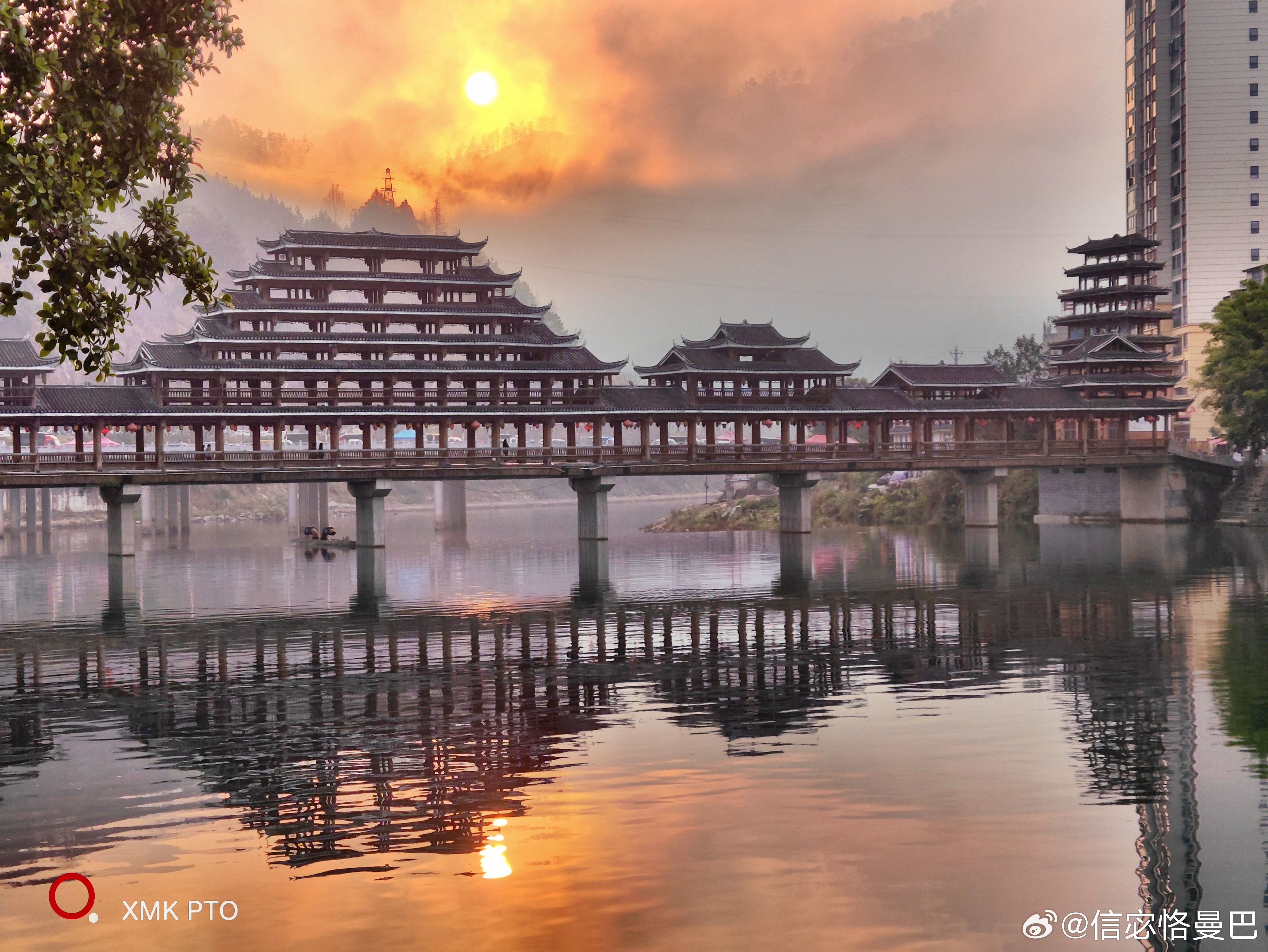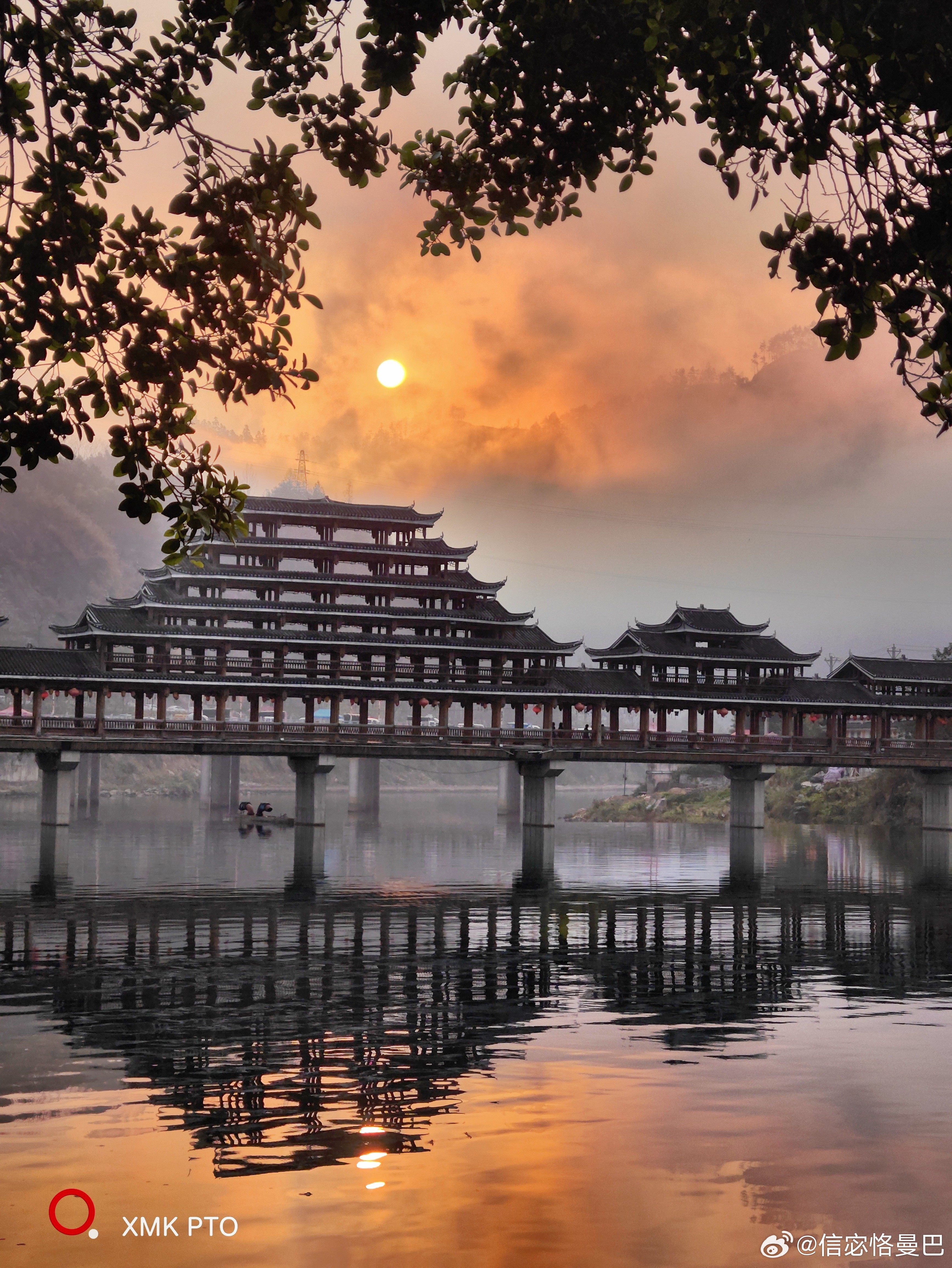 《霞映风雨桥》层楼叠翠锁烟波,飞檐翘角接云柯;朝暾穿雾金辉洒,桥影涵波玉镜磨。远岫含烟凝黛色,长桥卧浪起清歌;千年风雨凝精魄,一水横空映日蛾。旅行最美风景照