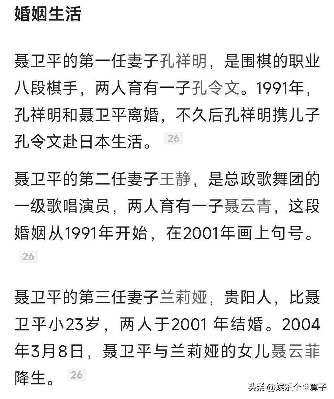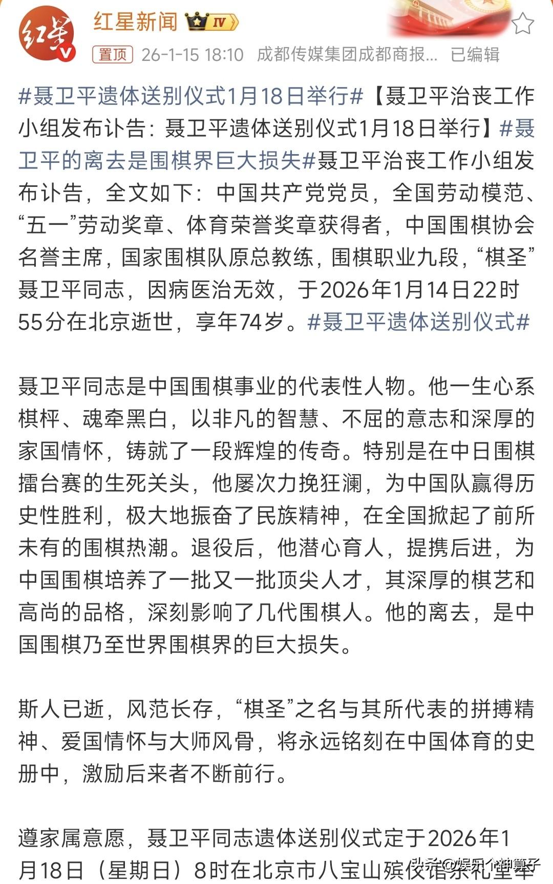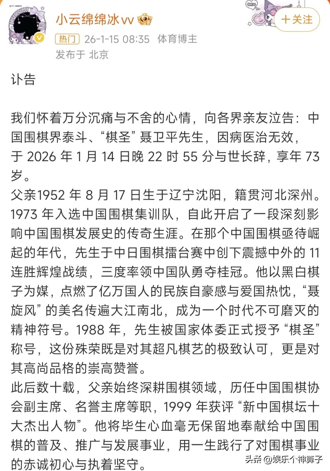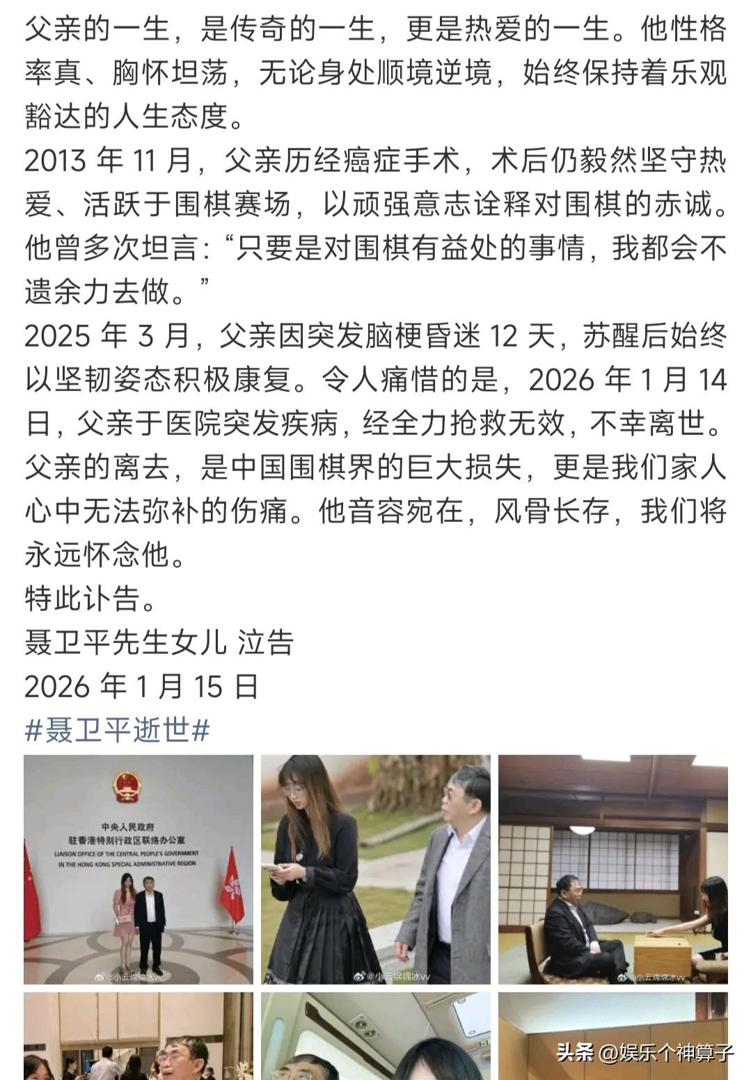 聂卫平老先生这一辈子值了!围棋领域登峰造极,女儿漂亮又孝顺…… 老先生去世的消息,令网友悲痛又惋惜,围棋界的成就自然不用多说,女儿发文悼念时用“泰斗”和“棋圣”来形容。 以前对老先生不太了解,特意科普一番,才知道有过三次婚姻,有两个儿子和一个女儿,感情丰富,可见非常有魅力! 有一点小疑惑,三个孩子,只看到女儿聂云菲发布讣告,按理说,儿子年长一些,仔细想想,或许没有在一起生活的原因吧! 看到聂云菲的发文和配图,不得不说,这个女儿不仅漂亮还孝顺。 老先生经历过手术,突发脑梗昏迷,康复期间,女儿一直陪在身旁,悉心照顾,都说久病床前无孝子,聂云菲真是好样的。 其中,还有一张看书的照片,老先生身旁的女士,应该是现任妻子吧! 话说,老先生这辈子值了,儿女双全,现任妻子温柔体贴,女儿漂亮又孝顺,生病期间有人照顾,一家人享受温馨时刻,最喜欢的职业,取得了较高的成就,应该没有任何遗憾了吧! 最新消息,据媒体报道,聂卫平老先生遗体告别仪式将于1月18日举行。 愿逝者安息,一路走好!