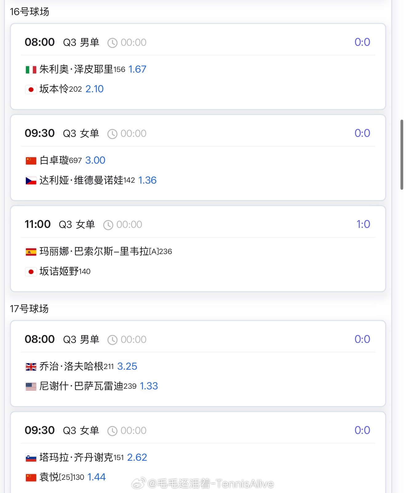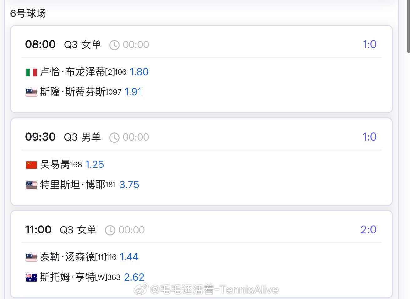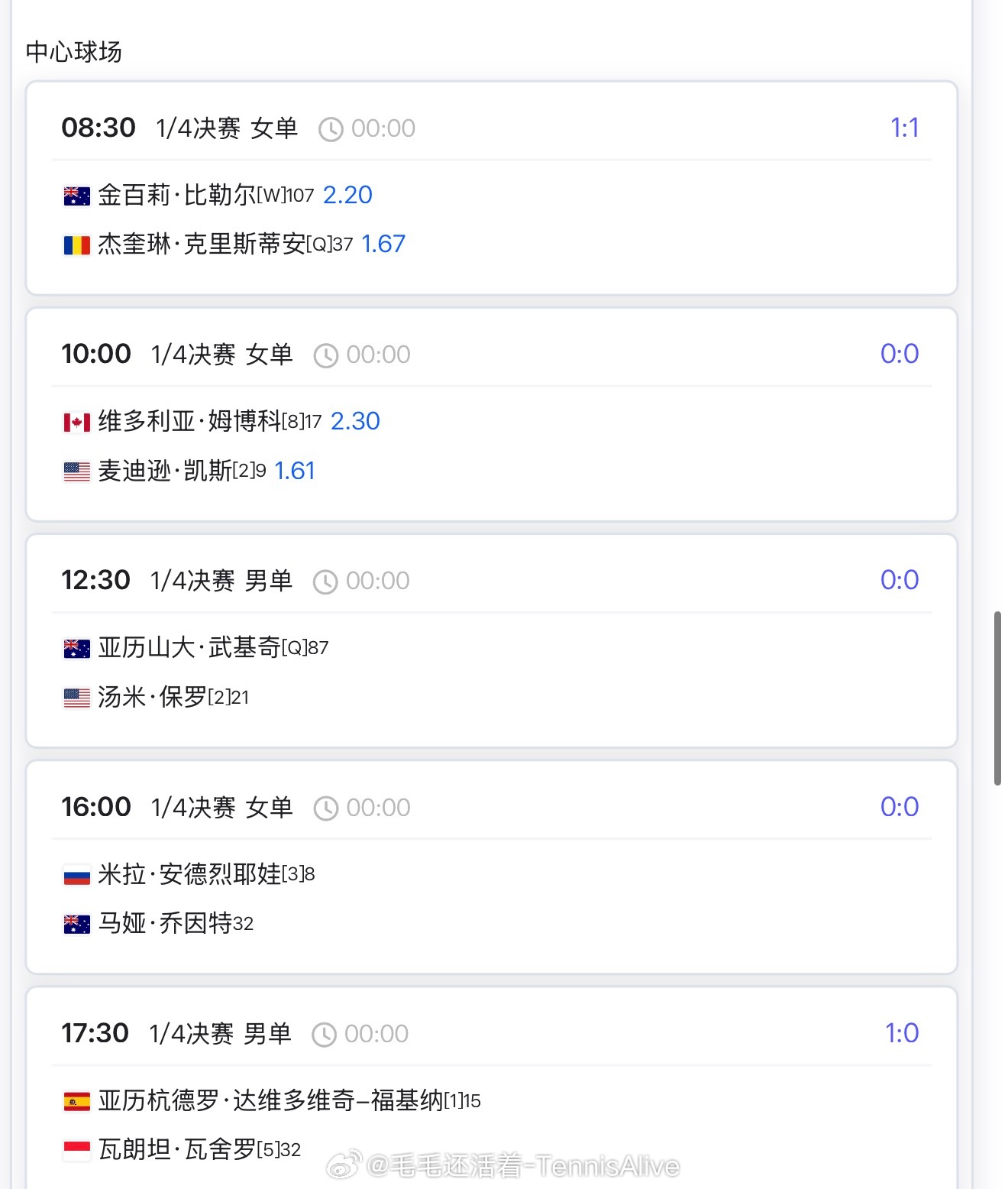 【1 月 15 日比赛赛程+直播赛程】10:00 黄泽林 vs伊梅尔(澳新银行)10:00 吴易昺 vs博耶(6 号球场)10:00 朱琳 vs 什塔库西奇(13 号球场)10:00 白卓璇 vs 维德曼诺娃(16 号球场)10:00 袁悦 vs齐丹谢克(17 号球场) 澳网2026