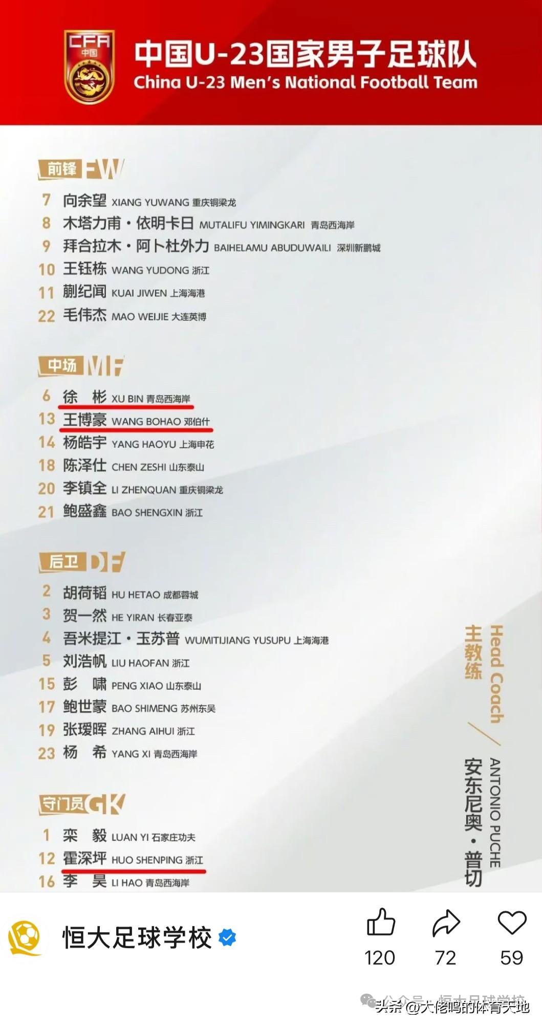 这次有三人,相信未来还会有更多人:“恒足制造”徐彬、霍深坪、王博豪位列参赛大名单!@恒大足球学校 一直实打实在为中国足球作贡献,即便喧嚣与嘈杂声不绝于耳,但他们坚定的心从未变过!徐彬赛后说的话可以代表他们了,继续努力,相信你们回越来越好! ——这是我们球队一直以来的信念,球员、教练、工作人员等所有人都非常团结,目标就是拿下每一场比赛。”至于即将在淘汰赛首轮对阵乌兹别克斯坦队,徐彬坦言:乌兹别克斯坦队在亚洲层面非常强,但是大家有信心,将会全力以赴。最后,他也十分感谢不远万里来支持国足的中国球迷。