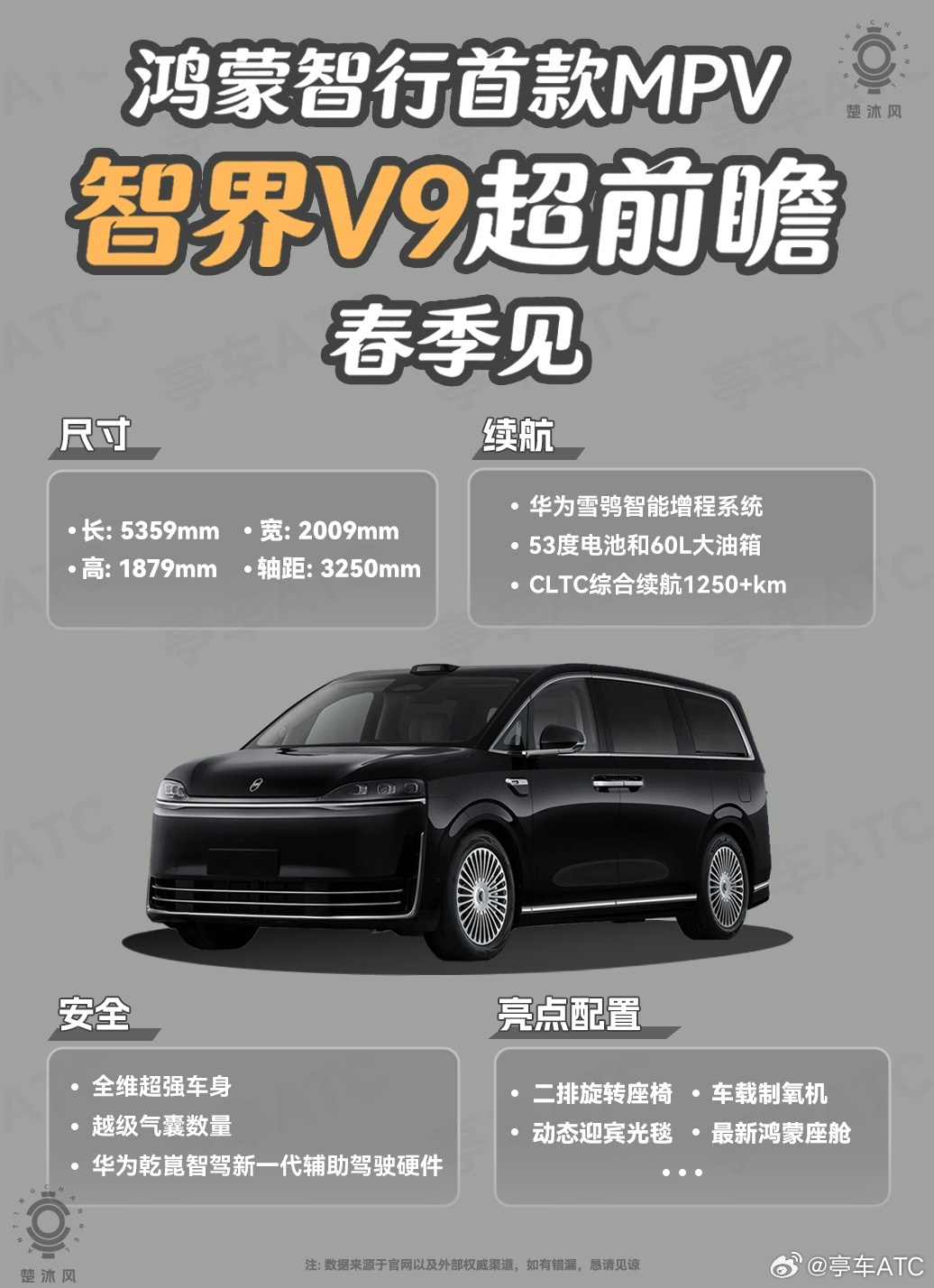 鸿蒙智行终于把触角伸到MPV领域了,首款车型智界V9的前瞻信息一曝光,就能看出华为这次依旧是带着“解题思路”来的。对于MPV用户来说,空间、续航、舒适性和安全这几个核心需求,智界V9几乎都给到了针对性的解决方案。先看尺寸,5359mm的车长搭配3250mm的轴距,已经摸到了中大型MPV的主流门槛,这种轴距表现意味着车内的乘坐空间,尤其是二排和三排的腿部空间,大概率不会让用户失望。续航方面更让人惊喜,华为雪鸮智能增程系统配上53度电池和60L大油箱,CLTC综合续航能突破1250km,这直接掐灭了MPV用户跑长途的续航焦虑,不管是商务出行还是家庭长途自驾,都不用频繁找补能点。安全层面,全维超强车身、越级数量的气囊,再加上华为乾崑智驾新一代辅助驾驶硬件,既守住了MPV最该看重的被动安全底线,也为主动安全和智能驾驶埋下了伏笔,毕竟MPV用户里家庭用户占比不低,安全这块的投入永远是加分项。至于舒适性配置,二排旋转座椅是高端MPV的标配,而车载制氧机、动态迎宾光毯这些配置,能看出华为在细节上的用心,尤其是车载制氧机,不管是应对高原路况还是日常提升乘坐体验,都显得很贴心,再加上最新的鸿蒙座舱,智能交互这块也依旧是华为的拿手好戏。整体来看,智界V9作为鸿蒙智行的首款MPV,没有盲目堆砌配置,而是精准戳中了MPV市场的用户痛点,这款车定档春季发布,毫无疑问会成为高端MPV市场的有力竞争者。大v聊车