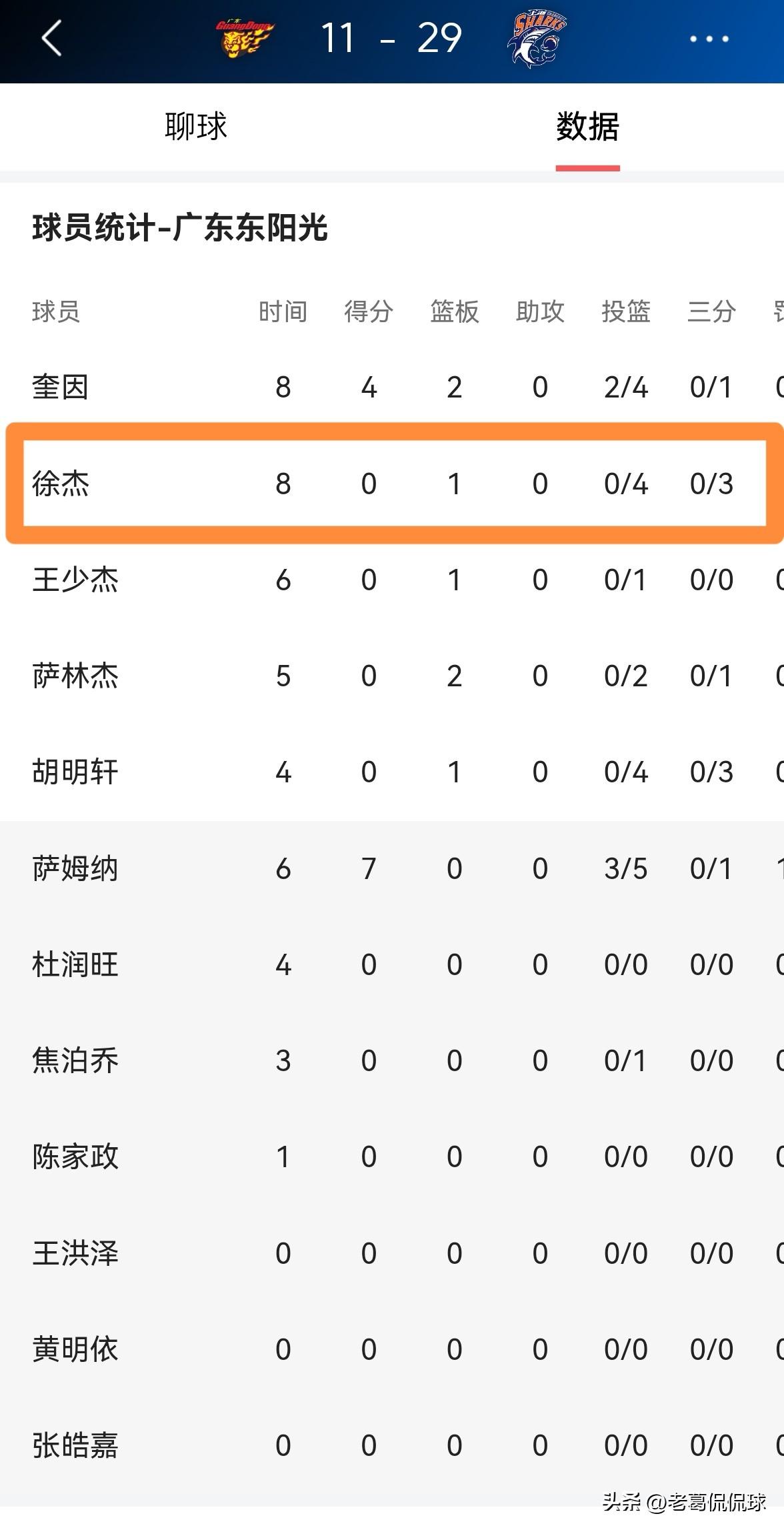 广东东阳光超级球星徐杰真是极度的低迷!在今天广东东阳光主场迎战上海久事的比赛中,目前双方的首节比赛已经结束,广东东阳光以11:29落后于对手。在第一节比赛中,手感冰凉的徐杰首发出战8分钟,投篮4中0,其中三分球3中0怒砍0分,还有2次犯规,他的场上正负值为-20。 总而言之,徐杰在第一节比赛中的表现简直就是一场灾难。