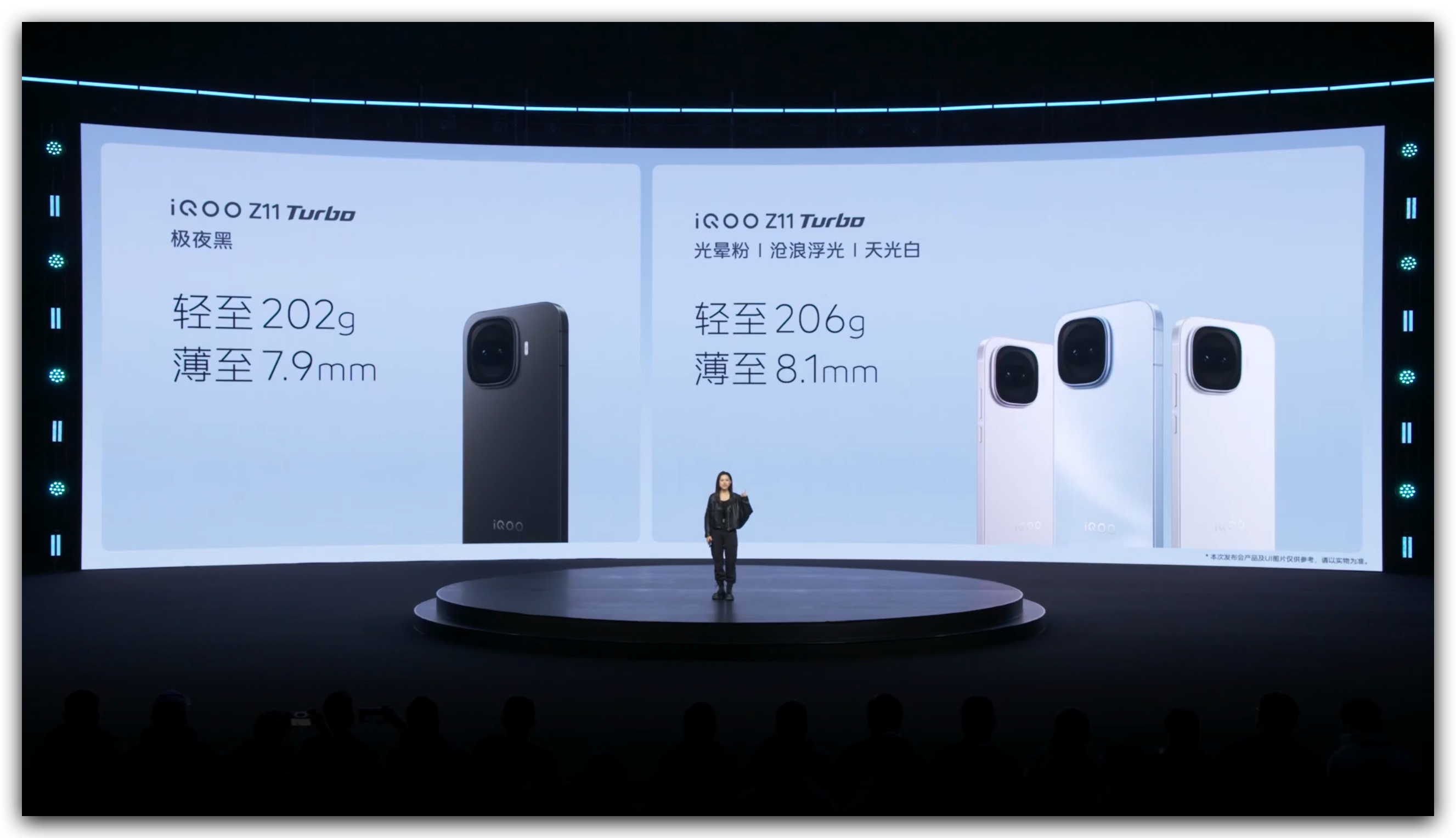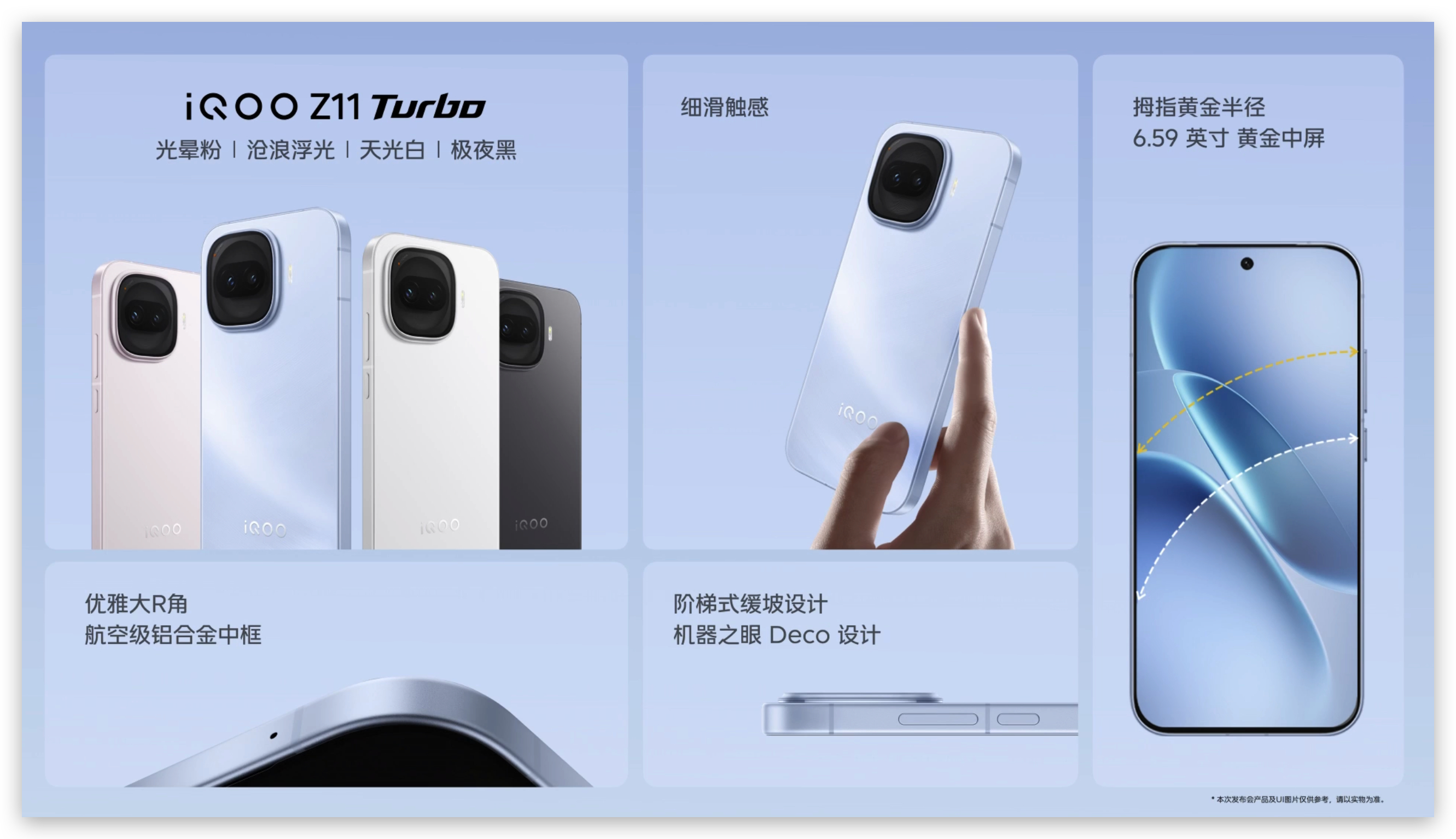iQOO Z11 Turbo 来啦!拥有蓝色、白色、粉色、黑色四款配色,金属中框设计,全新的Deco设计,6.59英寸,机身宽度74.42mm,握持感提升非常大。整机重202g,厚7.9mm。这个外观颜值是你们的菜吗?