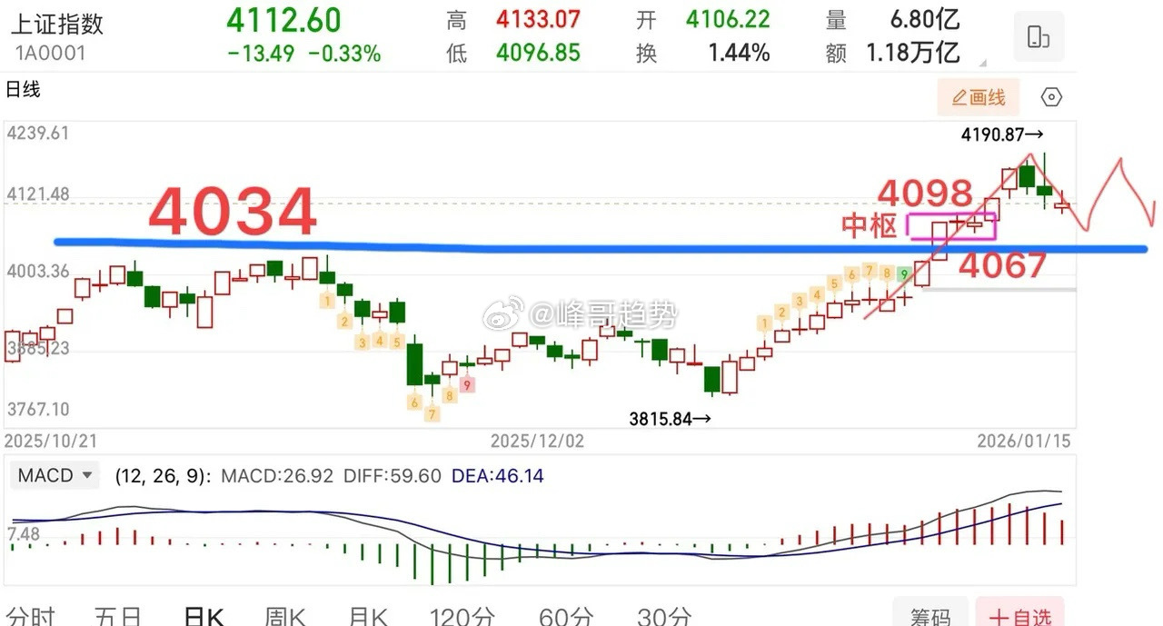 缩量1万亿,“人工降温”效果显著!后续怎么看? 周四大盘小幅震荡整理,收了根小十字星,意味着多空相对平衡,走势总体还是符合预期的,短线大概率横向震荡整理为主,5日线逐步靠拢10/20的一个过程。从周线的角度观察,也可当作是回踩确认4034的动作,目前来看走势还是处于合理的震荡范畴,且5周均线会继续向上发散,多头排列还在延续,所以大盘这个位置并不具备大跌的条件,横向震荡的概率更大,回踩只要不破4034就都可以接受。 所以,从周线,再到日线观察,走势就比较清晰了,只要能够维持小阴小阳结构的调整方式,且不破4034的条件下,就不用太担心。 震荡走势,对操作节奏要求比较高,不可过度激进,尤其是有“人工降温”的背景下,资金还是比较畏惧高度的,所以涨不去追,跌也没必要过度恐慌,买阴卖阳,把握好节奏即可。 个人观点,仅供参考!A股成交额缩量超一万亿