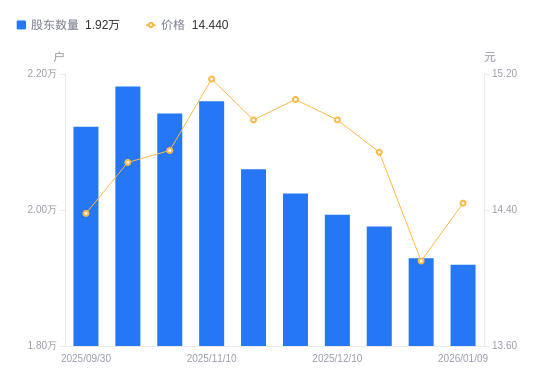 近一年(2025年1月10日至2026年1月9日),桂林三金A股股东户数从2.09万户,减低至1.92万户,降幅8.05%,区间股价上涨10.14%。