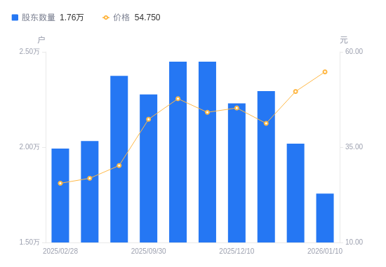 日期A股户数(户)流通A股户均持股数(股)户均持股市值(万元)2026-01-10175668085.2144.272025-12-31201807037.9034.912025-12-20229426190.5325.532025-12-10222956370.1828.842025-11-30244865800.1825.602025-10-31244865800.1827.672025-09-30227676238.1226.402025-06-30237405981.9718.052025-03-31203186989.4718.762025-02-28199227128.4018.20
