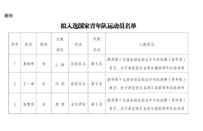 3名运动员拟入选国乒青年队 中国乒乓球协会发布关于对拟入选国家青年队运动员公示的通知:根据中国乒乓球协会关于印发《获得第十五届全国运动会乒乓球决赛优异成绩的运动员入队》的通知要求,3名运动员拟入选国家青年队:廖晓晴(上海)右削反正:获得第十五届全国运动会乒乓球决赛(青年组)男子、女子单打前8名的非国家青年队运动员丁一洋(河北)右削反长:获得第十五届全国运动会乒乓球决赛(青年组)男子、女子单打前8名的非国家青年队运动员徐慧尧(陕西)右直两反:获得第十五届全国运动会乒乓球决赛(青年组)男子、女子单打前8名的非国家青年队运动员