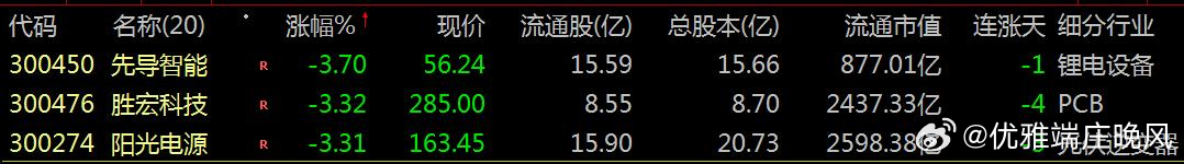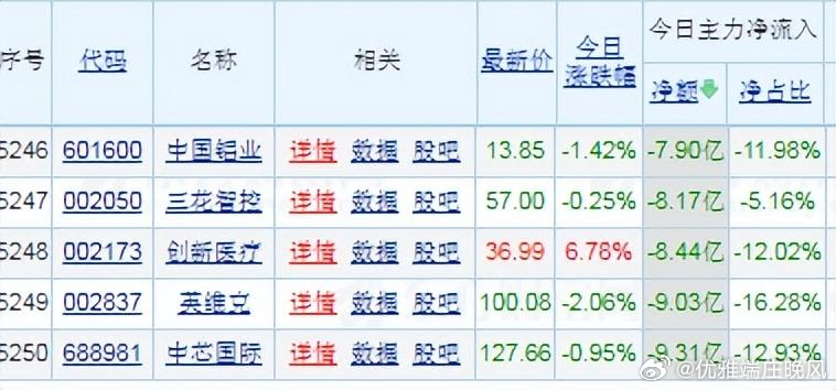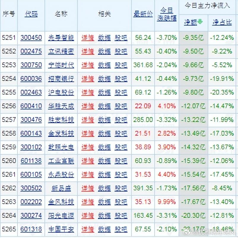 【财富晚茶】蛟龙携款逃逸:01.12收盘主力:资金净流出前20股票导语:作者系《网易号》优质财经领域创作者。曾经原创作者和知名网易号旅游领域创作者。大跨度行业等的写作,颇受网友喜爱。作品发表于2026.01.12.23:58 优雅端庄晚风。【内容概述】今日股市收评:主题是:【财富晚茶】蛟龙携款逃逸:01.12收盘主力:资金净流出前20股票。主旋律:今日主力资金:净流出前20股。蛟龙见顶劫款兑现:且战且退落袋为安。一、视野最新:资金涌出谁在杀跌1、视野复盘:跌幅前三300450 先导智能300476 胜宏科技300274 阳光电源1、风口行业:最跌公司第一、300450 先导智能靓丽底牌:全球领先新能源智能制造解决方案服务和头部企业。第二、300476 胜宏科技靓丽底牌:中国第一家新一代工业互联网智慧企业。第三、300274 阳光电源靓丽底牌:中国最大太阳能光伏逆变器头部企业。二、主力资金:谁在携筹兑现出逃1、601318 中国平安资金净流出:23.17亿元 核心逻辑:全国领先的综合性金融服务集团。晚间点评:观K线图:处在四年中位点,短线已突破前顶。短期视野:保险权重股受市场风格切换影响,资金从低估值蓝筹流向成长赛道,大金融板块短期承压。2、阳光电源 300274资金净流出:20.30亿元核心逻辑:中国最大太阳能光伏逆变器头部企业。晚间点评:光伏逆变器龙头,受行业“去银化”预期扰动,短期情绪波动加剧。3、金风科技 002202资金净流出:17.67亿元 核心逻辑:。晚间点评:风电板块短期涨幅过大,政策补贴预期边际减弱,机构调仓至低估值能源转型标的,部分外资减仓。4、新易盛 300502资金净流出:17.56亿元 核心逻辑:高性能光模块品牌优势企业。晚间点评:光模块核心标的,与中际旭创形成板块性资金撤离,反映短期情绪过热后的理性回归。5、600105 永鼎股份资金净流出:15.54亿元核心逻辑:中国最大线缆生产基地;市场占有率综合实力行业领先企业。晚间点评:股价盘中:一度上涨5%。但是主力:资金净流出显著。数据显示:净流出额在13.82亿元至15.54亿元之间。同期散户:资金呈现净流入。迥然不同:反映“主力出逃、散户接盘”格局。6、工业富联 601138资金净流出:15.39亿元核心逻辑:全球领先高端智能制造工业互联网服务商。7、300102 乾照光电资金净流出:14.32亿元核心逻辑:四元系红光LED芯片国内领先和国际先进企业。8、600143 金发科技资金净流出:13.49亿元核心逻辑:全球领先应用创新企业。9、300476 胜宏科技资金净流出:13.22亿元核心逻辑:中国第一家新一代工业互联网智慧企业。10、600410 华胜天成资金净流出:12.07亿元核心逻辑:中国软件与技术服务领域资深服务商和头部企业。11、002463 沪电股份资金净流出:9.80亿元核心逻辑:PCB行业领先地位企业。12、600036 招商银行资金净流出:9.73亿核心逻辑:世界一流商业银行。。13、300750 宁德时代资金净流出:9.66亿元核心逻辑:全球领先动力电池系统提供商。14、002475 立讯精密资金净流出:9.50亿元核心逻辑:中国制造2025”行业领导者和世界同行业开拓者。15、300450 先导智能资金净流出:9.35亿元核心逻辑:全球领先新能源智能制造解决方案服务和头部企业。16、688981中芯国际资金净流出:9.31亿元。核心逻辑:全球领先集成电路晶圆代工企业。17、002837 英维克资金净流出:9.03亿元核心逻辑:国内领先精密温控节能设备头部提供供商。18、002173 创新医疗资金净流出:8.44亿元核心逻辑:珍珠行业唯一农业产业化国家重点龙头企业。19、002050 三花智控资金净流出:8.17亿核心逻辑:气候智能控制系统行业全球领军企业。20、601600 中国铝业资金净流出:7.90亿核心逻辑:全球最大氧化铝等生产供应商。三、视野背景:资金特点强弱逻辑1、资金政策:双面杀手今日主力:资金净流出的板块:主要集中在电力设备、电子和汽车行业。2、估值市场:高低差距估值层面:市场资金从高估值成长板块向低估值价值+政策催化题材迁移。3、产业趋势:市场风口第一、半导体。第二、有色。第三、商业航天。第四、脑机接口。第五、国产替代。四、本创作品:优质财金网易作者投资投机迷茫之中:给予尽可能有帮助:资本市场风险自负。
