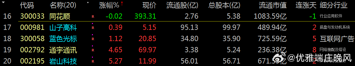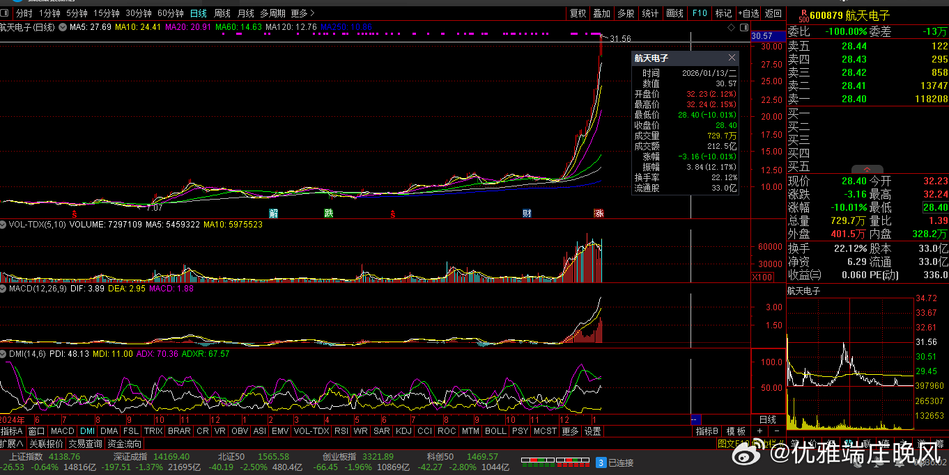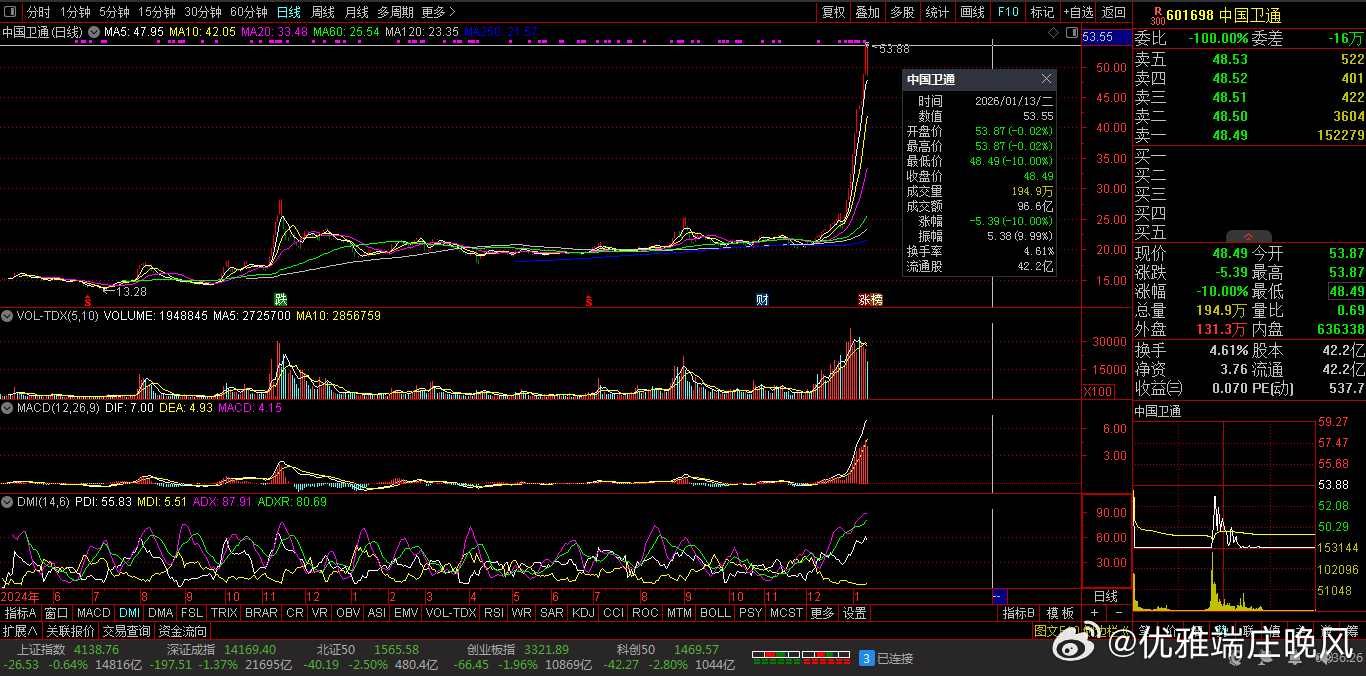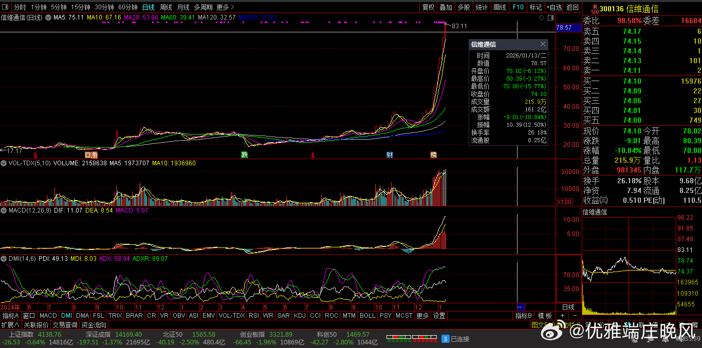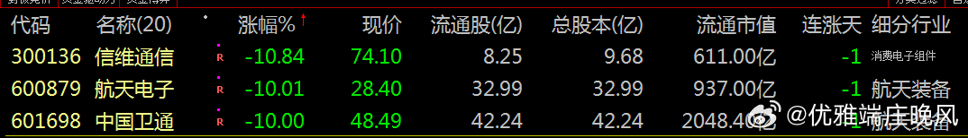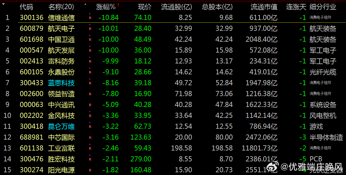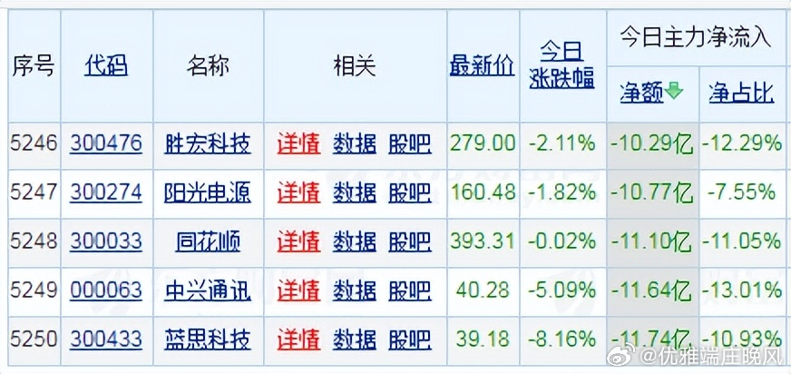 【财富晚茶】蛟龙携款逃逸:01.13收盘主力:资金净流出前20股票导语:作者系《网易号》优质财经领域创作者。曾经原创作者和知名网易号旅游领域创作者。大跨度行业等的写作,颇受网友喜爱。作品发表于2026.01.13.23:58 优雅端庄晚风。【内容概述】今日股市收评:主题是:【财富晚茶】蛟龙携款逃逸:01.13收盘主力:资金净流出前20股票。主旋律:今日主力资金:净流出前20股。蛟龙见顶劫款兑现:且战且退落袋为安。一、视野最新:资金涌出谁在杀跌1、视野复盘:跌幅前三300136 信维通信600879 航天电子601698 中国卫通1、风口行业:最跌公司第一、300136 信维通信靓丽底牌:公司技术水平国内领先,国内品牌手机天线市场领市场地位。第二、600879 航天电子靓丽底牌:航天电子信息和无人系统行业领军企业。第三、601698 中国卫通靓丽底牌:全球网引领者。二、主力资金:谁在携筹兑现出逃1、金风科技(002202)资金净流出:50.42亿元核心逻辑:中国最大的风力发电机组整机制造商。收盘点评:观K线图:处在16年次低点,近期已突破前顶。短期视野:风电行业竞争加剧及股价下跌。2、航天电子(600879)资金净流出:43.78亿元核心逻辑:航天电子信息和无人系统行业领军企业。收盘点评:观K线图:处在十年次低点,近期已突破三顶。短期视野:航天军工板块调整及股价跌停。3、蓝色光标(300058)资金净流出:29.76亿元,占总成交额39.92%核心逻辑:全球数字产业集引领者。收盘点评:观K线图:处在十年次低点,近期已突破三顶。短期视野:广告营销行业需求下滑及股价波动。4、领益智造(002600)资金净流出:23.82亿元,占总成交额8.34%核心逻辑:中国最大的电机用永磁铁氧体生产商。收盘点评:观K线图:处在十年次低点,近期已突破三顶。短期视野:消费电子行业周期性波动及股价下跌。5、昆仑万维(300418)资金净流出:20.78亿元,占总成交额22.40%核心逻辑:全球化的互联网头部公司。收盘点评:观K线图:处在十年次低点,近期已突破三顶。短期视野:AI技术迭代压力及行业竞争加剧。6、航天发展(000547)资金净流出:20.76亿元,占总成交额18.24%核心逻辑:军品生产任务的重点骨干企业。收盘点评:观K线图:处在十年次低点,近期已突破三顶。短期视野:航天军工板块调整及股价跌停。7、工业富联(601138)资金净流出:20.09亿元,占总成交额0.97%核心逻辑:全球数字经济领军企业。收盘点评:观K线图:处在十年次低点,近期已突破三顶。短期视野:消费电子需求疲软及行业竞争加剧。8、雷科防务(002413)资金净流出:18.93亿元,占总成交额33.96%核心逻辑:蒸发器和冷凝器两器出口额排名全国第一。收盘点评:观K线图:处在十年次低点,近期已突破三顶。短期视野:股价跌停及行业需求下滑。9、信维通信(300136)资金净流出:17.52亿元,占总成交额26.18%核心逻辑:公司技术水平国内领先,国内品牌手机天线市场领市场地位。。收盘点评:观K线图:处在十年次低点,近期已突破三顶。短期视野:股价跌停及行业竞争加剧。10、通宇通讯(002792)资金净流出:16.91亿元,占总成交额50.70%核心逻辑:移动通信天线领域行业第一梯队。收盘点评:观K线图:处在十年次低点,近期已突破三顶。短期视野:股价上涨但资金流出,可能与行业需求波动有关。11、科大讯飞(002230)资金净流出:4.68亿元,占总成交额10.23%核心逻辑:教育医疗等行业大模型领先企业。收盘点评:观K线图:处在十年次低点,近期已突破三顶。短期视野:AI技术迭代压力及行业竞争加剧^[历史问答]^。12、安泰科技(000969)资金净流出:5.13亿元,占总成交额11.45%核心逻辑:中国金属新材料行业头部创新引领企业。收盘点评:观K线图:处在十年次低点,近期已突破三顶。短期视野:原材料成本上升及业绩不及预期^[历史问答]^。13、舍得酒业(600702)资金净流出:4140.84万元,占总成交额6.35%核心逻辑:全国最大规模优质白酒生产企业。收盘点评:观K线图:处在十年次低点,近期已突破三顶。短期视野:股东会决议及行业需求下滑^[历史问答]^。14、柳工(000528)资金净流出:4134.12万元,占总成交额6.99%核心逻辑:全球领先的装备与技术解决方案提供商。收盘点评:观K线图:处在十年次低点,近期已突破三顶。短期视野:工程机械行业周期性波动^[历史问答]^。15、何氏眼科(301103)资金净流出:470.39万元,占总成交额未明确核心逻辑:全生命周期眼健康管理的集团型连锁医疗机构。收盘点评:观K线图:处在十年次低点,近期已突破三顶。短期视野:股价波动及行业需求变化^[历史问答]^。16、久远银海(002777)资金净流出:2168.07万元,占总成交额未明确核心逻辑:智慧民生领军企业。收盘点评:观K线图:处在十年次低点,近期已突破三顶。短期视野:业绩不及预期及行业竞争加剧^[历史问答]^。17、翰宇药业(300199)资金净流出:1.2亿元,占总成交额未明确核心逻辑:多肽制剂和多肽原料药全球市场覆盖头部企业。收盘点评:观K线图:处在十年次低点,近期已突破三顶。短期视野:股价波动及行业需求下滑^[历史问答]^。18、达安基因(002030)资金净流出:890.51万元,占总成交额未明确核心逻辑:基因诊断技术试剂产品领先企业。收盘点评:观K线图:处在十年次低点,近期已突破三顶。短期视野:股价波动及行业需求变化^[历史问答]^。19、建设工业(002265)资金净流出:6.3亿元,占总成交额未明确核心逻辑:汽车连杆产品市场占有率处于领先企业。收盘点评:观K线图:处在十年次低点,近期已