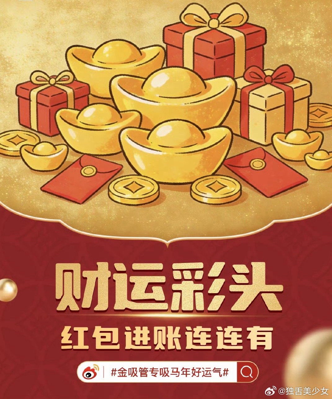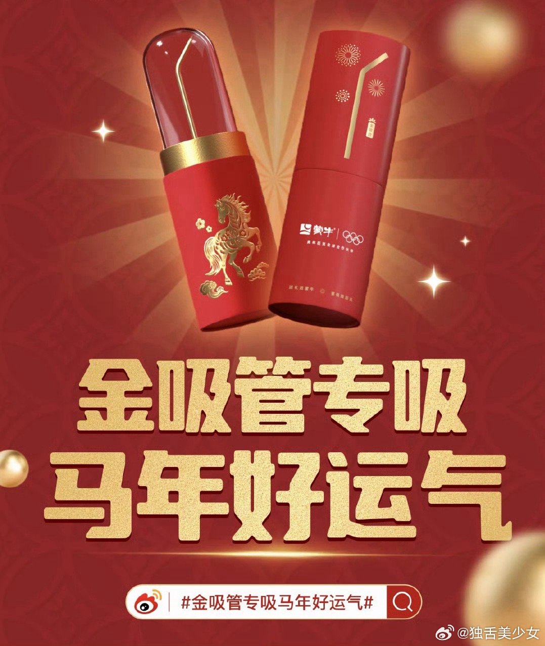 金吸管专吸马年好运气马年至,福气到,金吸管来把运招!吸尽八方吉气,纳满四海财气,揽全人间喜气,留住满心福气。愿新岁策马扬鞭,前路坦荡无阻碍,事业红火节节升,生活美满甜如蜜,家人安康常欢笑,万事胜意皆可期,日子越过越红火,好运常驻不缺席!