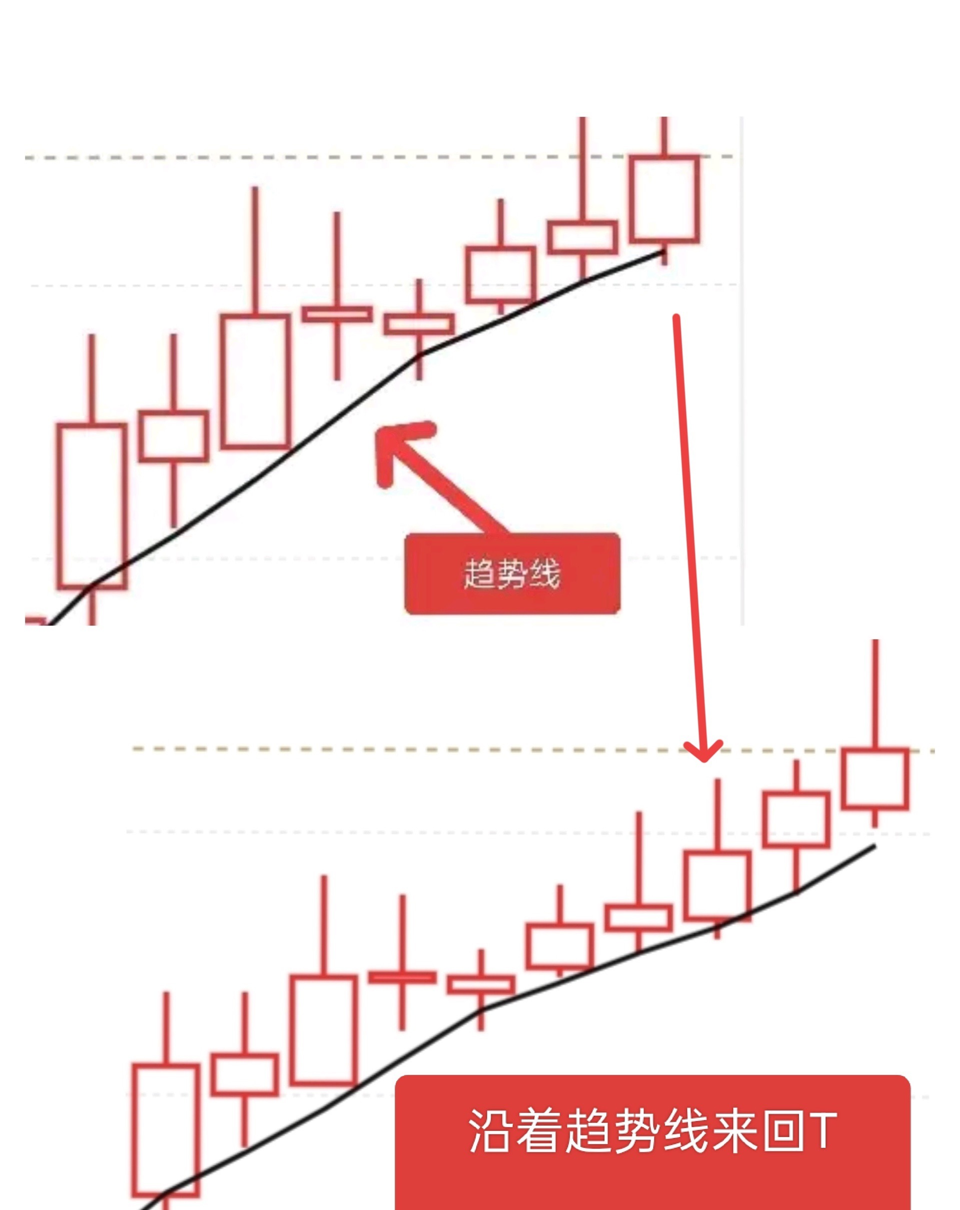 这种高位退潮,该怎么做才能在逆势中生存下来?你要知道,退潮期高位已经不是我们的首选,远离高位就是对自己的一种负责,高位博弈的价值已经不大了,这个说了两三天了吧,如果还要去高位博弈,很难解套那么是不是就要往低位靠拢?低位什么样的才能安全?就是趋势线!前天给大家画了两个图,都是说的低位趋势线!就是股价连续当当当的回打,就是不破掉某一条支撑线,这里就可以来回滚动,这样的都很安全!如果你要求不是很高,并不喜欢大幅的波动,这样的形态就是首选!用做T去不停的扩大利润所以没事多找找这种,就是踩到某条线,一直有下影线的,高低切这样的会让你非常安稳,看下图今日看盘a股