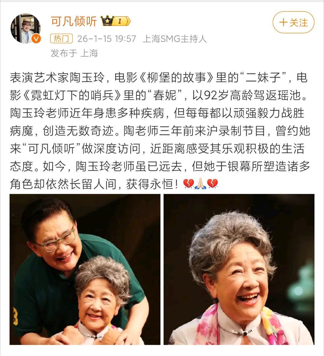 【群星悼念陶玉玲】冯远征悼念陶玉玲记者获悉,电影艺术家陶玉玲于15日在北京去世,享年92岁。发文悼念,“陶玉玲老师一路走好”。曹可凡透露,陶玉玲近年身患多种疾病,但每每都以顽强毅力战胜病魔。陶玉玲曾出演《二泉映月》《霓虹灯下的哨兵》等,2017年获得第16届中国电影表演艺术学会金凤凰奖终身成就奖。一路走好!