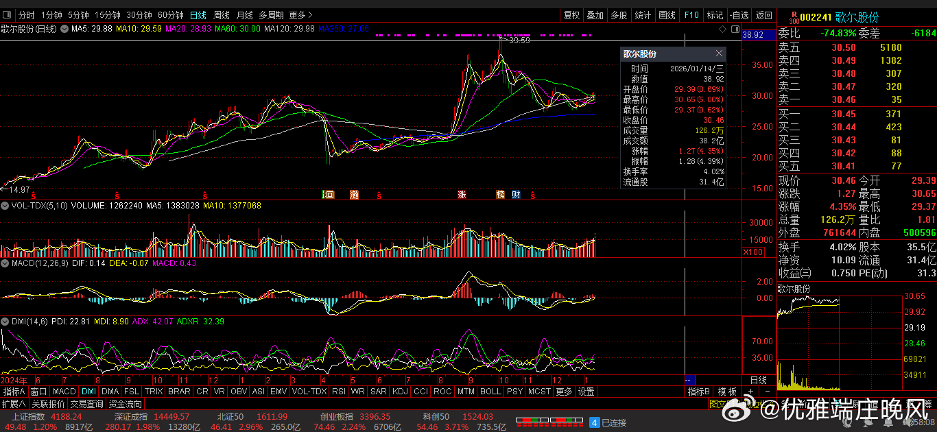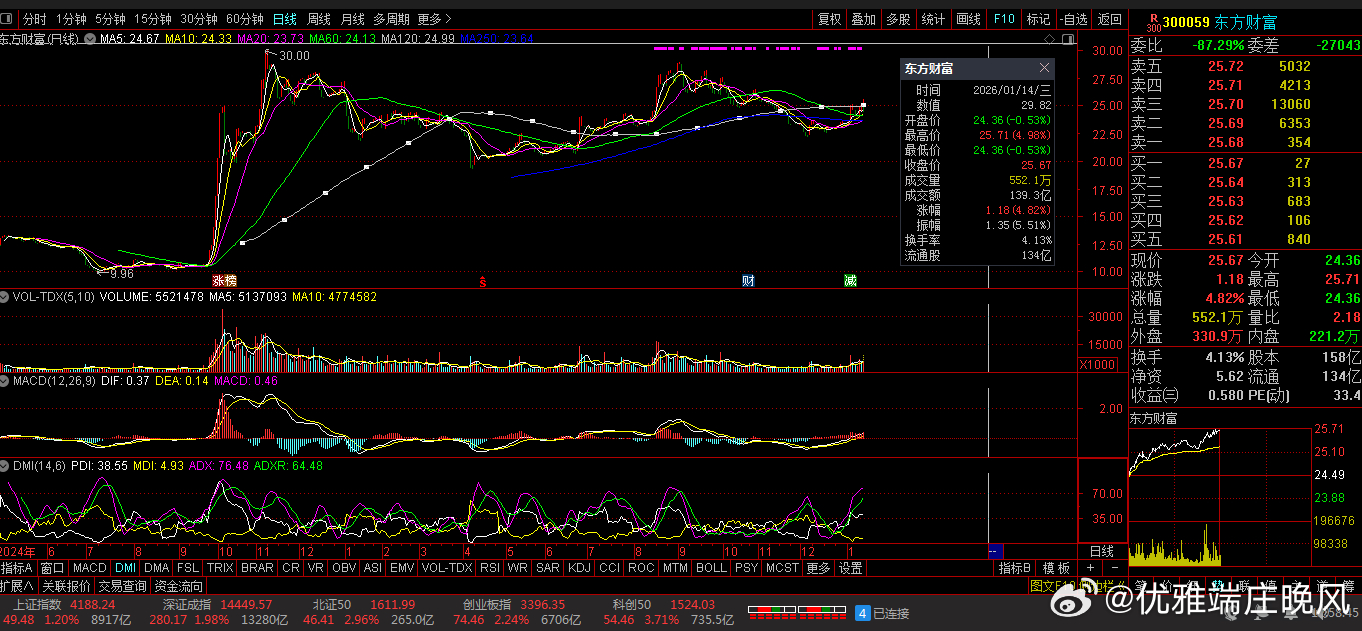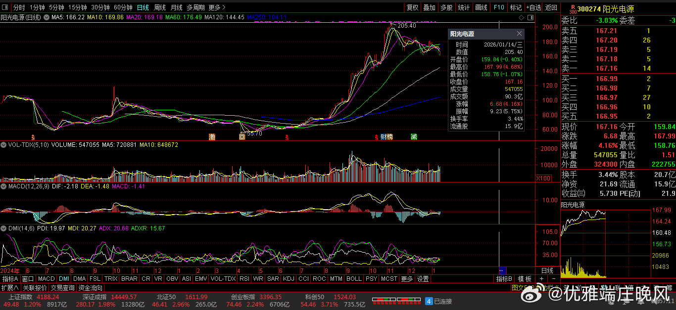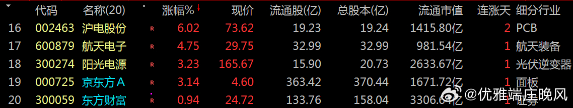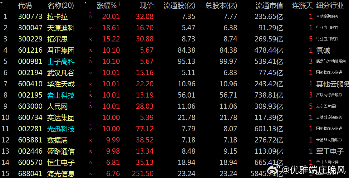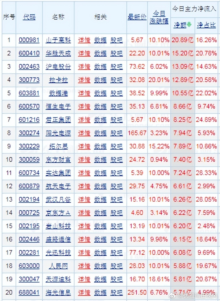 【财富晚茶】潜龙浮出水面:01.14主力资金:净流入前20股票导语:作者系《网易号》优质财经领域创作者。曾经原创作者和知名网易号旅游领域创作者。大跨度行业等的写作,颇受网友喜爱。作品发表于2026.01.14.23:58 优雅端庄晚风。【内容概述】今日股市收评:主题是:【财富晚茶】潜龙浮出水面:01.14主力资金:净流入前20股票。主旋律:今日主力资金:净流入前20股。主力投资潜龙浮出:越战越勇叠创新高。第一、300773 拉卡拉靓丽底牌:国内最大的线下便民支付服务商。第二、300047 天源迪科靓丽底牌:应用软件领域的领先企业。第三、300229 拓尔思靓丽底牌:中国非结构化信息处理技术领域的领先企业。二、视野背景:资金为王:前20强股复盘潜龙:浮出水面追踪资金:沪深北市:净流入股票。主要集中:三大因素:政策调整、板块轮动\资金动向三方面。1、000981 山子高科涨跌幅:10.10%。净流入:20.89亿核心逻辑:全球知名汽车自动变速器独立制造商。晚间点评:汽车电子+新能源赛道,资金对智能汽车作为下一代AI重要终端的共识强烈,公司受益于汽车智能化渗透率提升及新能源汽车产业链复苏。2、600410 华胜天成涨跌幅:10.01%。净流入:15.20亿核心逻辑:新—代数字化创新服务的领先企业。晚间点评:公司全面推进“AI+算力”战略,拥有新一代人工智能算力中心整体解决方案,并与头部科技企业合作。推出了智能客服、投标大王等AI原生产品。资金技术因素:当日主力资金净流入明显,超大单呈净买入状态,且技术指标如MACD金叉可能吸引技术派资金。3、002463 沪电股份涨跌幅:06.02%。净流入:13.09亿核心逻辑:PCB行业内的重要品牌和行业领先。晚间点评:PCB+算力硬件赛道,作为PCB龙头,获大资金进场推动股价上涨,资金对电子元件细分赛道的布局意图明显。4、300773 拉卡拉涨跌幅:20.01%。净流入:12.89亿核心逻辑:国内最大的线下便民支付服务商。晚间点评:预期2025年净利润202%至242%。通过转让:普惠信息、润信保理等回笼资金3.54亿元,聚焦支付+SaaS核心业务,拓展跨境支付至亚马逊、TEMU等20多个全球电商平台。5、603881 数据港涨跌幅:09.99%。净流入:10.55亿核心逻辑:数据中心全生命周期解决方案能力的综合服务提供商。晚间点评:阿里巴巴概念+IDC服务+三季报增长+上海国资的多重利好共振。双11重保:连续16年为双十一提供数据中心重保。超大单净买入:MACD金叉:短期多头趋势明显,技术面助推涨停。6、600570 恒生电子涨跌幅:06.81%。净流入:08.66亿核心逻辑:Light行业第一技术平台。晚间点评:金融IT+AI赛道,金融科技标的涨停且获超10亿资金流入,资金对金融科技细分赛道的炒作热度较高。7、601216 君正集团涨跌幅:10.10%。净流入核心逻辑:全球竞争力科技驱动型现代化大型企业集团。晚间点评:智能体技术应。持有天弘基金15.60%股权间接关联蚂蚁科技,叠加数字经济概念热度。超大单资金明显流入。MACD金叉与短期均线多头排列显现上涨动能。8、300274 阳光电源涨跌幅:3.23%。净流入:7.94亿核心逻辑:中国最大太阳能光伏逆变器头部企业。晚间点评:光伏逆变器+储能赛道,新能源赛道龙头获资金布局,虽涨幅相对较低,但大额资金流入体现对新能源赛道的长期配置型布局。9、300229 拓尔思涨跌幅:15.222% 。净流入:7.89亿核心逻辑:中国非结构化信息处理技术领先企业。晚间点评:其AI智能体平台(TTAgentFlow)已在高价值垂直行业规模化落地,预计2026年AI业务收入同比增速达60%-80%。10、300059 东方财富涨跌幅:0.94%。净流入:7.40亿核心逻辑:中国用户访问量最大黏性最高互联网财经头部信息平台。晚间点评:市净率稳定增长,反映公司净资产价值提升,当前估值水平具有较高安全边际。机构投资者对东方财富的持仓比例持续上升,得益于其在金融科技领域的深耕和稳健的业绩表现。11、600734 实达集团涨跌幅:10.00%。净流入:7.24亿核心逻辑:政府与企业提供数字化转型的标准化产品与深度运营服务。晚间点评:14日触及涨停,驱动因素:收购数产名商科技95%股权,智算中心项目具备2000P算力。大数据业务收入同比增长显著,治理优化和资产质量改善也起到了支撑作用。通过以物抵债方式收回账龄超5年的应收账款1373.7万元,改善资产质量,增强了投资者信心。公司规模相对较小,订单落地节奏存在不确定性。12、600879 航天电子涨跌幅:04.75%。净流入:6.11亿核心逻辑:航天电子信息无人系统技术世界一流军队建设头部企业。晚间点评:商业航天+军工赛道,获大额资金流入推动股价拉升,反映资金对军工科技赛道的关注度提升。13、002194 武汉凡谷涨跌幅:10.01%。净流入:6.26亿核心逻辑:国际一流的移动通信天馈系统射频器件独立供应商。晚间点评:2026年1月14日涨停,核心逻辑是商业航天+卫星导航+射频器件概念驱动。参与中国卫星互联网建设。拓展新领域。投资光钜微电子:主营BAW滤波器芯片,14、000725 京东方A涨跌幅:3.14%。净流入:6.22亿核心逻辑:全球半导体显示领域领军企业及物联网领域全球创新型企业。晚间点评:显示面板+物联网赛道,低估值修复,资金对显示面板细分赛道的布局意图明显。15、002195 岩山科技涨跌幅:10.01%。净流入:6.20亿核心逻辑:全球领先智能化科技公司。晚间点评:业务与政策高度契合,L3级自动驾驶政策落地利好智能驾驶方案,脑机接口技术获地方研发补贴,增强了长期确定性。16、002446 盛路通信涨跌幅:9.98%。净流