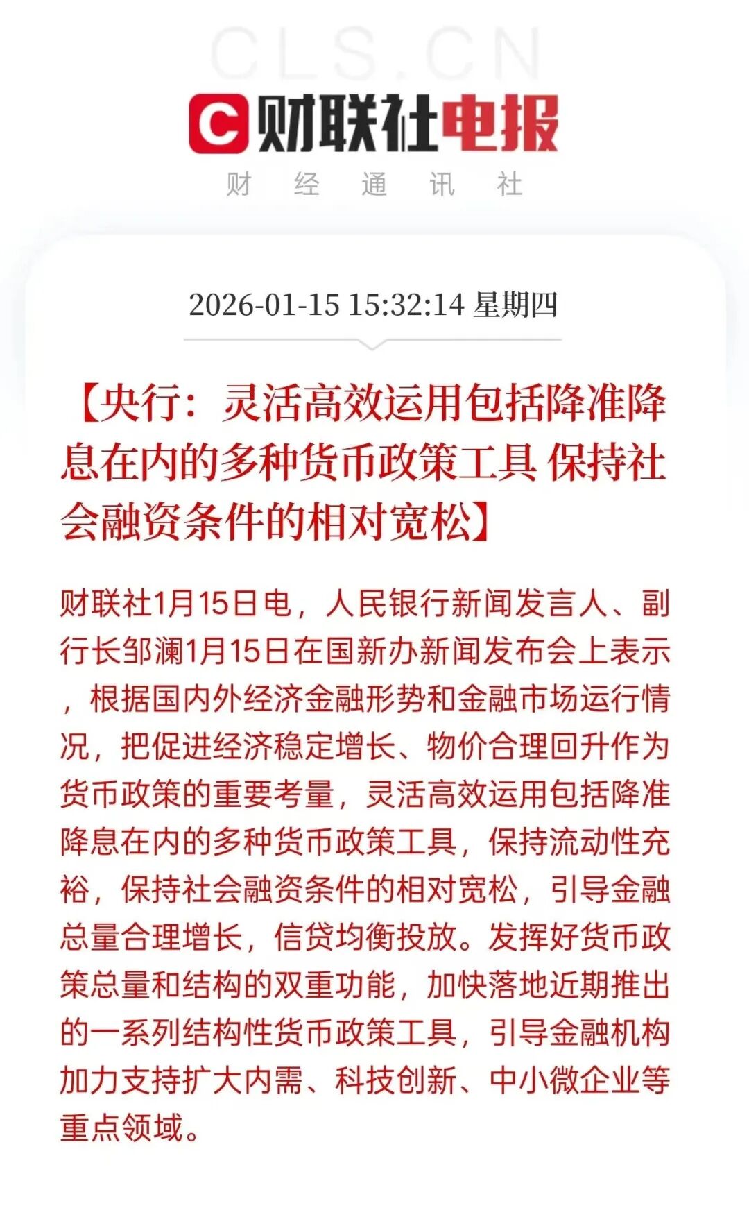 刚刚(1月15日),中国人民银行新闻发言人、副行长邹澜在新闻发布会表示,将灵活高效运用包括降准降息在内的多种货币政策工具,且下调商业用房首付下限。